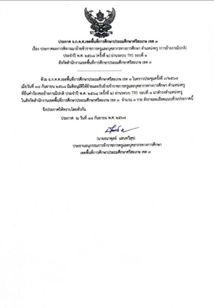 ประกาศผลการพิจารณาย้ายข้าราชการครูและบุคลากรทางการศึกษา ตำแหน่งครู (การย้ายกรณีปกติ) ประจำปี พ.ศ. 2568 (ครั้งที่ 2) ผ่านระบบ TRS รอบที่ 1 สังกัด สำนักงานเขตพื้นที่การศึกษาประถมศึกษาศรีสะเกษ เขต 3 กันยายน 18, 2025 Last updated : กันยายน 18, 2025 person จำนวนคนดู : 164