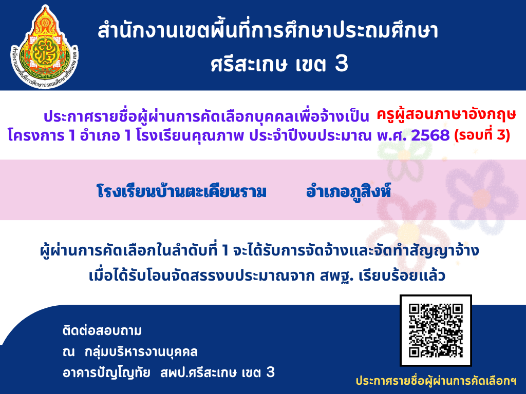 ประกาศรายชื่อผู้ผ่านการคัดเลือกบุคคลเพื่อจ้างเป็นครูผู้สอนภาษาอังกฤษโครงการ 1 อำเภอ 1 โรงเรียนคุณภาพ ประจำปีงบประมาณ พ.ศ. 2569 (รอบที่ 3) โรงเรียนบ้านตะเคียนราม อำเภอภูสิงห์ กุมภาพันธ์ 6, 2026 Last updated : กุมภาพันธ์ 6, 2026 person รายละเอียดเพิ่มเติม จำนวนคนดู : 29