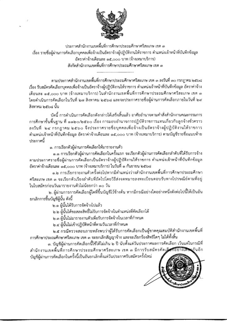 ประกาศสำนักงานเขตพื้นที่การศึกษาประถมศึกษาศรีสะเกษ เขต 3เรื่อง รายชื่อผู้ผ่านการคัดเลือกบุคคลเพื่อจ้างเป็นอัตราจ้างผู้ปฏิบัติงานให้ราชการ ตำแหน่งเจ้าหน้าที่บันทึกข้อมูลอัตราค่าจ้างเดือนละ 15,000 บาท (จ้างเหมาบริการ)สังกัดสำนักงานเขตพื้นที่การศึกษาประถมศึกษาศรีสะเกษ เขต 3 สิงหาคม 27, 2025 Last updated : สิงหาคม 27, 2025 person รายละเอียดเพิ่มเติม จำนวนคนดู : 35