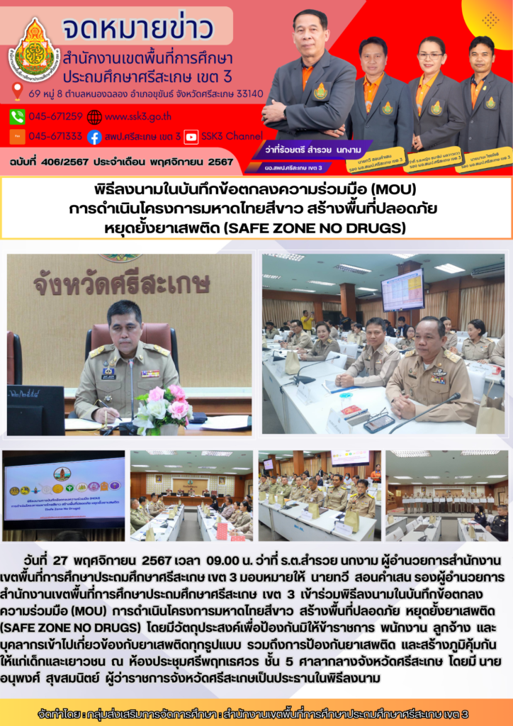 พิธีลงนามในบันทึกข้อตกลงความร่วมมือ (MOU) การดำเนินโครงการมหาดไทยสีขาว สร้างพื้นที่ปลอดภัย หยุดยั้งยาเสพติด (Safe Zone No Drugs) พฤศจิกายน 29, 2024 Last updated : พฤศจิกายน 29, 2024 Chananthita จำนวนคนดู : 119
