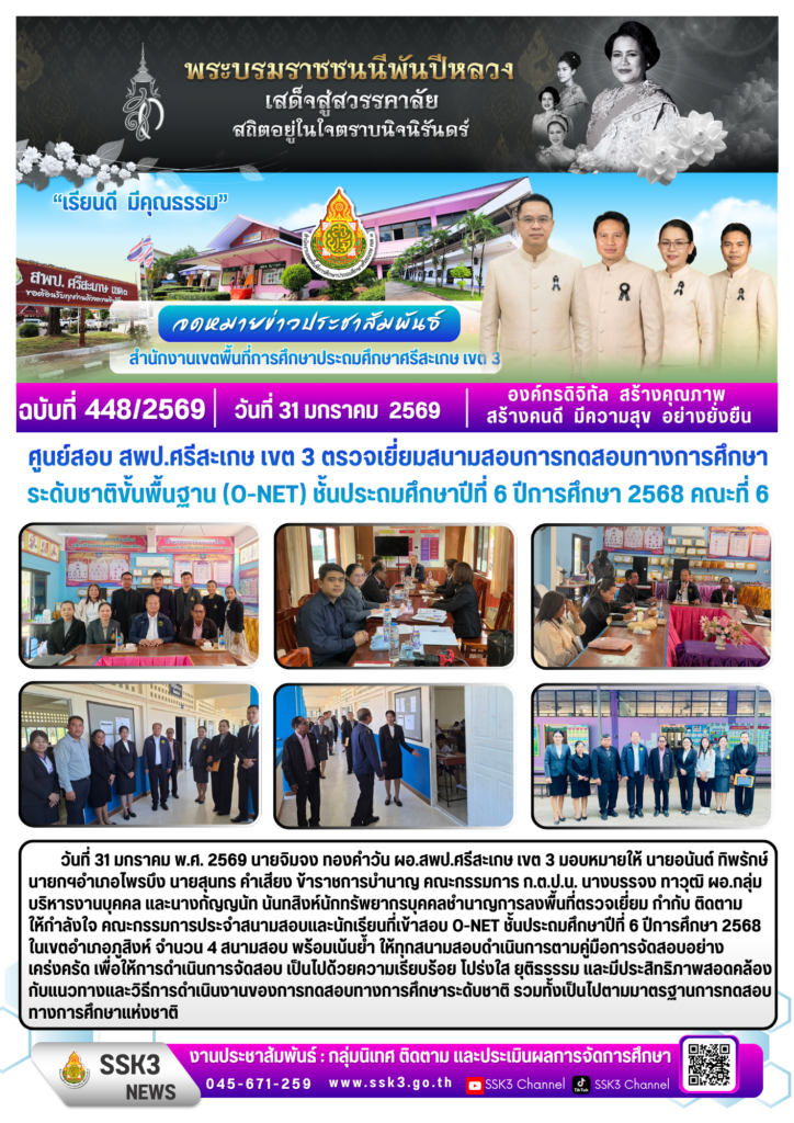 ศูนย์สอบ สพป.ศรีสะเกษ เขต 3 ตรวจเยี่ยมสนามสอบการทดสอบทางการศึกษาระดับชาติขั้นพื้นฐาน (O-NET) ชั้นประถมศึกษาปีที่ 6 ปีการศึกษา 2568 คณะที่ 6 กุมภาพันธ์ 12, 2026 Last updated : กุมภาพันธ์ 12, 2026 nitad จำนวนคนดู : 8