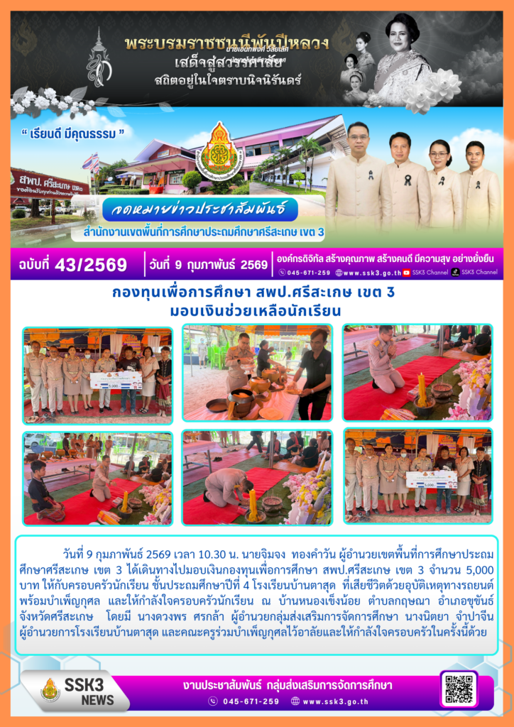 กองทุนเพื่อการศึกษา สพป.ศรีสะเกษ เขต 3 มอบเงินช่วยเหลือนักเรียน กุมภาพันธ์ 11, 2026 Last updated : กุมภาพันธ์ 11, 2026 Chanyaphat จำนวนคนดู : 12