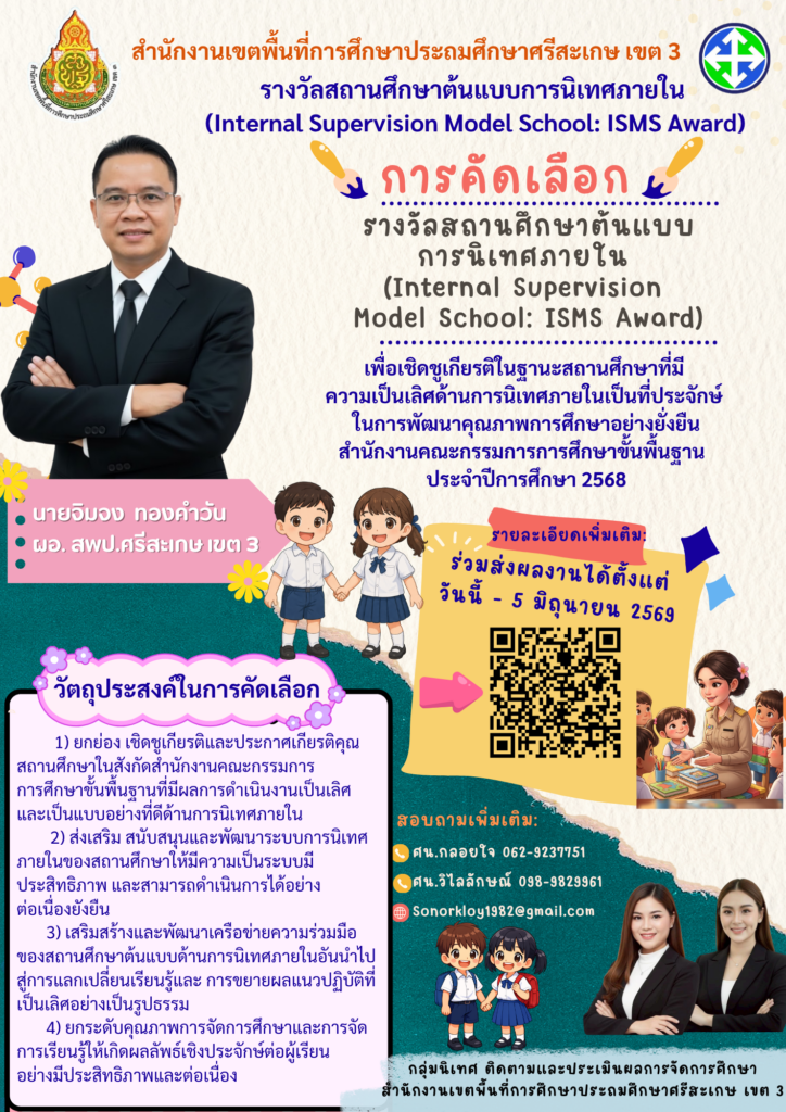 การคัดเลือกสถานศึกษาเพื่อรับรางวัลสถานศึกษาต้นแบบการนิเทศภายใน(Internal Supervision : ISMS Award) ประจำปีการศึกษา 2568✅เพื่อส่งเสริมและยกระดับคุณภาพการนิเทศภายในสถานศึกษาให้เป็นระบบ มีประสิทธิภาพ และเป็นแบบอย่างที่ดี
