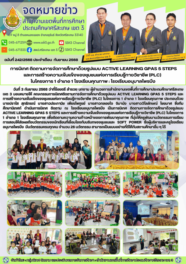 การนิเทศ ติดตามการจัดการศึกษาด้วยรูปแบบ Active Learning GPAS 5 Steps และการสร้างความเข้มแข็งของชุมชนแห่งการเรียนรู้ทางวิชาชีพ (PLC) ในโครงการ 1 อำเภอ 1 โรงเรียนคุณภาพ : โรงเรียนอนุบาลไพรบึง
