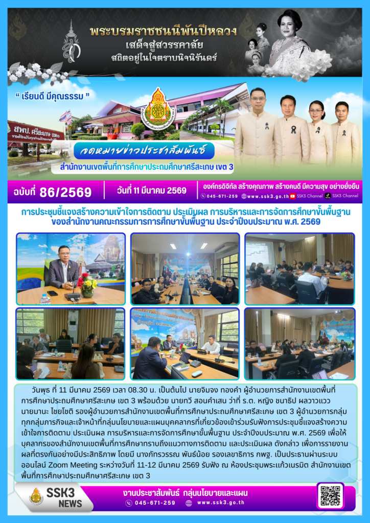 การประชุมชี้เเจงสร้างความเข้าใจการติดตาม ประเมินผล การบริหารและการจัดการศึกษาขั้นพื้นฐาน มีนาคม 11, 2026 Last updated : มีนาคม 11, 2026 sirivimon ของสำนักงานคณะกรรมการการศึกษาขั้นพื้นฐาน ประจำปีงบประมาณ พ.ศ. 2569 จำนวนคนดู : 13