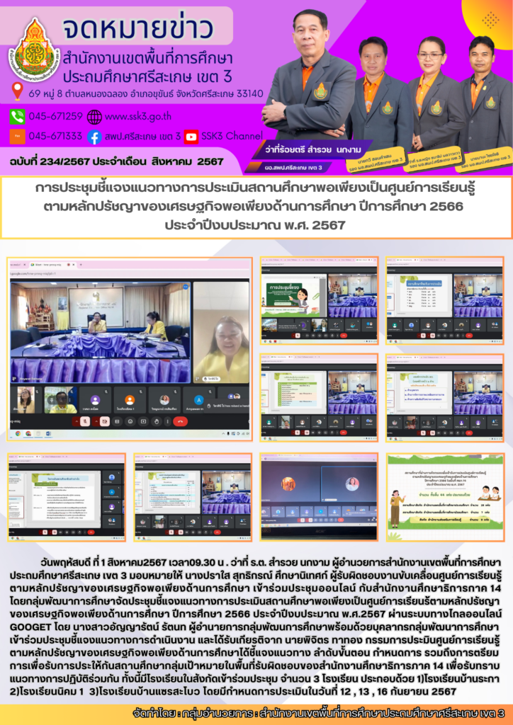 การประชุมชี้แจงแนวทางการประเมินสถานศึกษาพอเพียงเป็นศูนย์การเรียนรู้ ตามหลักปรัชญาของเศรษฐกิจพอเพียงด้านการศึกษา ปีการศึกษา 2566 ประจำปีงบประมาณ พ.ศ. 2567 สิงหาคม 2, 2024 Last updated : สิงหาคม 2, 2024 Chananthita จำนวนคนดู : 66