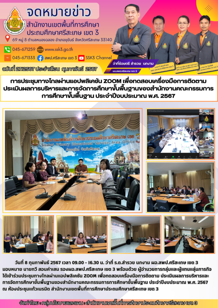 การประชุมทางไกลผ่านแอปพลิเคชัน ZOOM เพื่อทดสอบเครื่องมือการติดตาม ประเมินผลการบริหารและการจัดการศึกษาขั้นพื้นฐานของสำนักงานคณะกรรมการการศึกษาขั้นพื้นฐาน ประจำปีงบประมาณ พ.ศ. 2567 กุมภาพันธ์ 14, 2024 Last updated : กุมภาพันธ์ 14, 2024 Chananthita จำนวนคนดู : 57