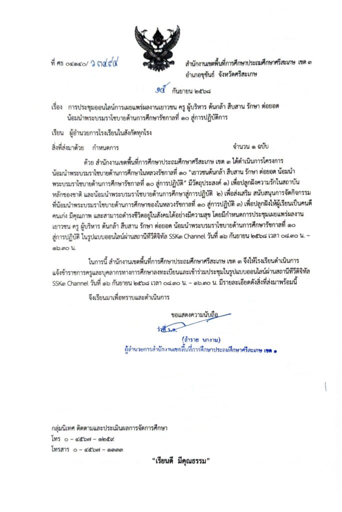 การประชุมออนไลน์เผยแพร่ผลงานเยาวชน ครู ผู้บริหาร ต้นกล้า สืบสาน รักษา ต่อยอด น้อมนำพระบรมราโชบายด้านการศึกษารัชกาลที่ 10 สูการปฏิบัติ กันยายน 16, 2025 Last updated : กันยายน 16, 2025 nitad คลิ๊ก หนังสือที่ ว3494 จำนวนคนดู : 19