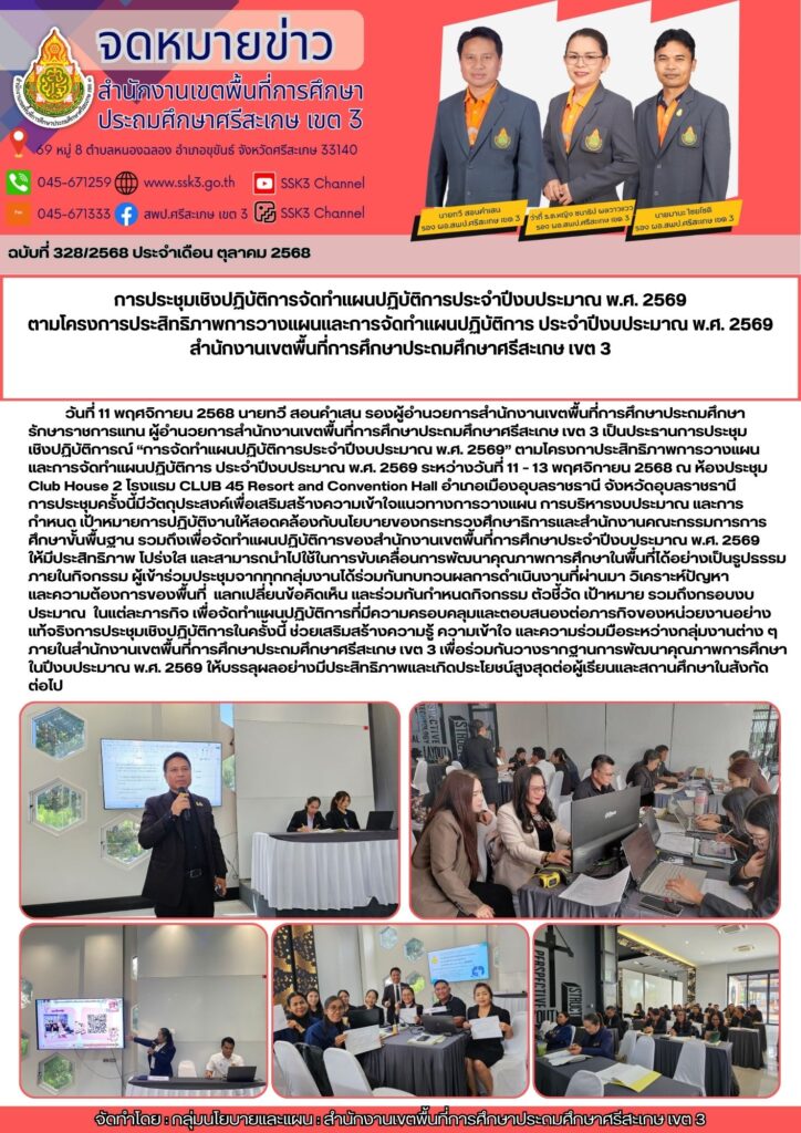 การประชุมเชิงปฏิบัติการจัดทำแผนปฏิบัติการประจำปีงบประมาณ พ.ศ. 2569 ตามโครงการประสิทธิภาพการวางแผนและการจัดทำแผนปฏิบัติการ ประจำปีงบประมาณ พ.ศ. 2569 พฤศจิกายน 12, 2025 Last updated : พฤศจิกายน 14, 2025 sirivimon สำนักงานเขตพื้นที่การศึกษาประถมศึกษาศรีสะเกษ เขต 3 จำนวนคนดู : 5