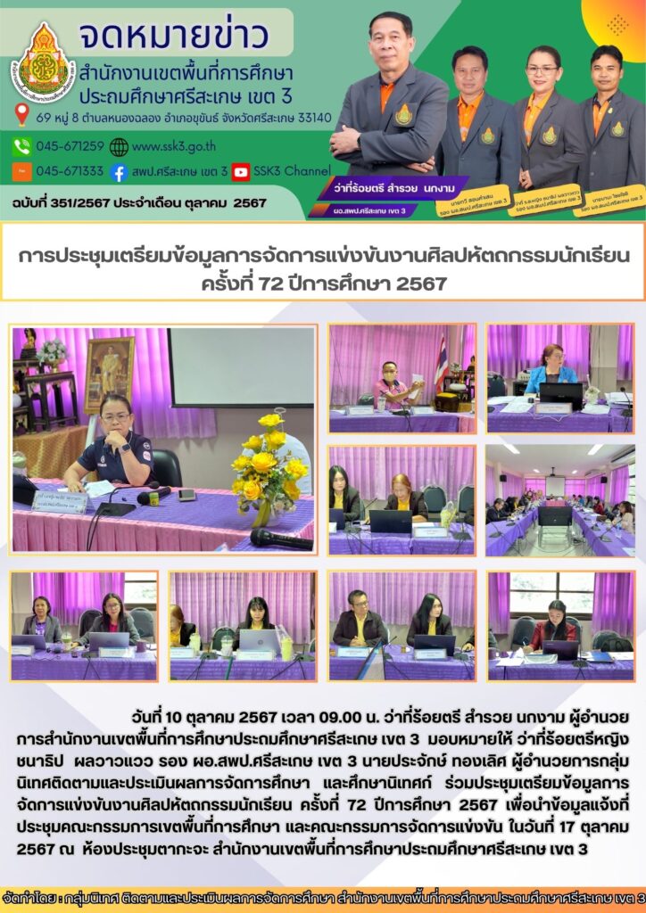 การประชุมเตรียมข้อมูลการจัดการแข่งขันงานศิลปหัตถกรรมนักเรียน ครั้งที่ 72 ปีการศึกษา 2567 พฤศจิกายน 25, 2024 Last updated : พฤศจิกายน 25, 2024 Chananthita จำนวนคนดู : 62