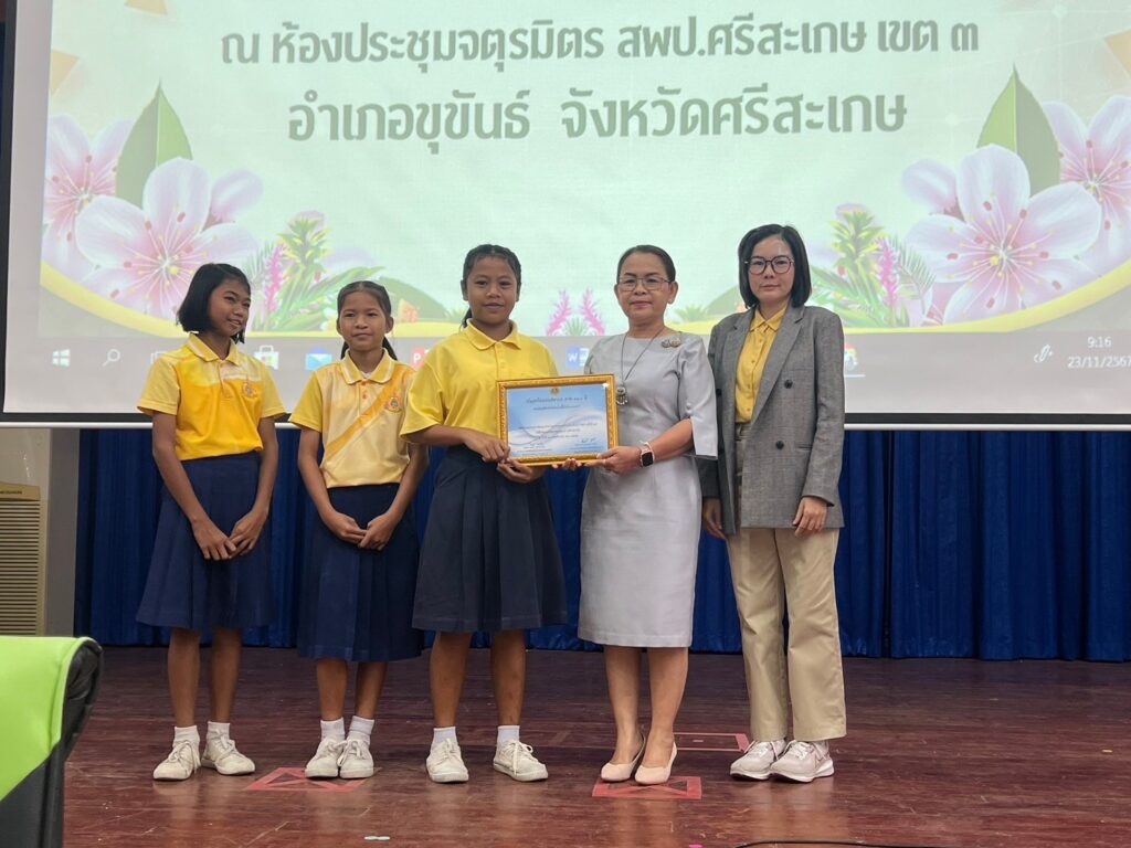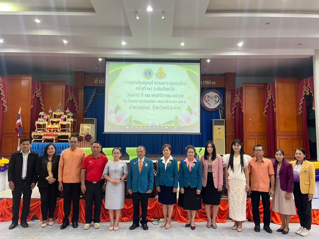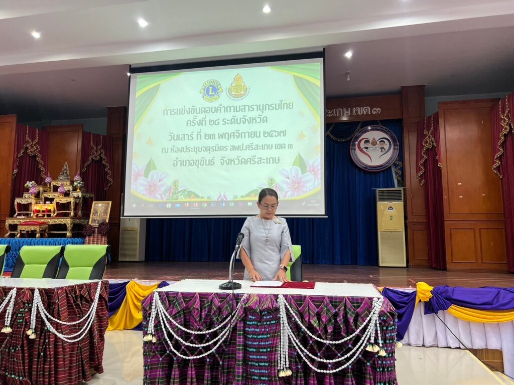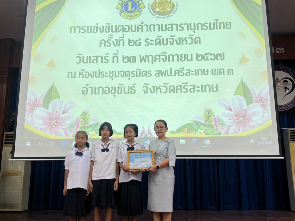 วันเสาร์ที่ 23 พฤศจิกายน 2567 ณ ห้องประชุมจตุรมิตร สำนักงานเขตพื้นที่การศึกษาประถมศึกษาศรีสะเกษ เขต 3 ว่าที่ร้อยตรี สำรวย นกงาม ผอ.สพป.ศรีสะเกษ เขต 3 ได้มอบหมายให้ ว่าที่ร้อยตรีหญิง ชนาธิป ผลวาวแวว รองผอ.สพป.ศรีสะเกษ เขต 3 เป็นประธานในพิธีเปิดการแข่งขันตอบคำถาม สารานุกรมไทยสำหรับเยาวชนฯ ครั้งที่ 28 ระดับจังหวัดศรีสะเกษ โดยสโมสรไลออนส์สากลภาครวม 310 ประเทศไทย ร่วมกับสำนักงานคณะกรรมการการศึกษาขั้นพื้นฐาน ได้จัดแข่งขันตอบคำถามสารานุกรมไทยมาต่อเนื่องเป็นปีที่ 28 โดยจัดแข่งขันในระดับจังหวัด ระดับภาค และระดับประเทศ เพื่อชิงถ้วยพระราชทานสมเด็จพระกนิษฐาธิราชเจ้า กรมสมเด็จพระเทพรัตนราชสุดา สยามบรมราชกุมารี เป็นการส่งเสริมและสนับสนุนให้เด็กเยาวชนไทย มีนิสัยรักการอ่าน สโมสรไลออนส์ศรีสะเกษ ภาค 310 E จัดการแข่งขันครั้งนี้ โดยมีนักเรียนสมัครเข้าร่วมแข่งขันวันนี้ ระดับประถมศึกษาตอนปลาย (ชั้นประถมศึกษาปีที่ 4–6) จำนวน 37 ทีม ระดับมัธยมศึกษาตอนต้น (ชั้นมัธยมศึกษาปีที่ 1–3) จำนวน 19 ทีม แบบทดสอบระดับประถมศึกษาตอนปลาย มีข้อคำถาม จำนวน 80 ข้อ ระดับมัธยมศึกษาตอนต้น มีข้อคำถามจำนวน 100 ข้อ สนามแข่งขันสำนักงานเขตพื้นที่การศึกษาประถมศึกษาศรีสะเกษ เขต 3 (ชั้นประถมศึกษาปีที่ 4–6) จำนวน 37 ทีม รางวัลชนะเลิศ ได้แก่ โรงเรียนบ้านกอกหวาน คะแนน 38 คะแนน รองชนะเลิศอันดับที่ 1 ได้แก่ โรงเรียนบ้านเรือทองคลองคำ คะแนน 38 คะแนนรองชนะเลิศอันดับที่ 2 ได้แก่ โรงเรียนบ้านดอนหลี่ คะแนน 36 คะแนน ระดับมัธยมศึกษาตอนต้น (ชั้นมัธยมศึกษาปีที่ 1– 3) จำนวน 19 ทีม รางวัลชนะเลิศ ได้แก่ โรงเรียนปรางค์กู่ คะแนน 71 คะแนน รองชนะเลิศอันดับที่ 1 ได้แก่ โรงเรียนขุขันธ์ คะแนน 54 คะแนน รองชนะเลิศอันดับที่ 2 ได้แก่ โรงเรียนบ้านปราสาท คะแนน 53 คะแนน การดำเนินงานเป็นไปด้วยความเรียบร้อย ขอขอบพระคุณทุกท่านที่มีส่วนเกี่ยวข้องในการดำเนินงานครั้งนี้ ขอขอบพระคุณมา ณ โอกาสนี้ค่ะ