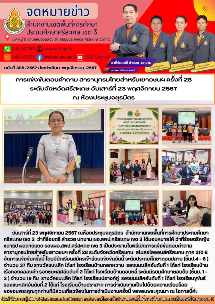 การแข่งขันตอบคำถาม สารานุกรมไทยสำหรับเยาวชนฯ ครั้งที่ 28 ระดับจังหวัดศรีสะเกษ พฤศจิกายน 25, 2024 Last updated : พฤศจิกายน 25, 2024 Chananthita จำนวนคนดู : 57