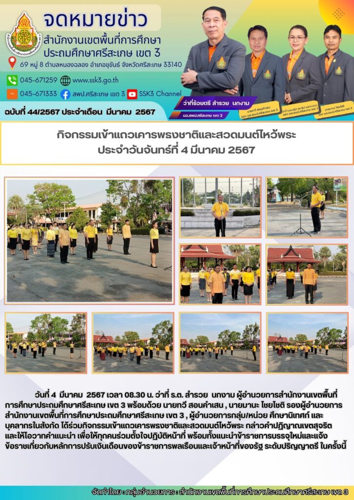 กิจกรรมเข้าแถวเคารพธงชาติและสวดมนต์ไหว้พระประจำวันจันทร์ที่ 4 มีนาคม 2567 มีนาคม 18, 2024 Last updated : มีนาคม 18, 2024 Chananthita จำนวนคนดู : 35
