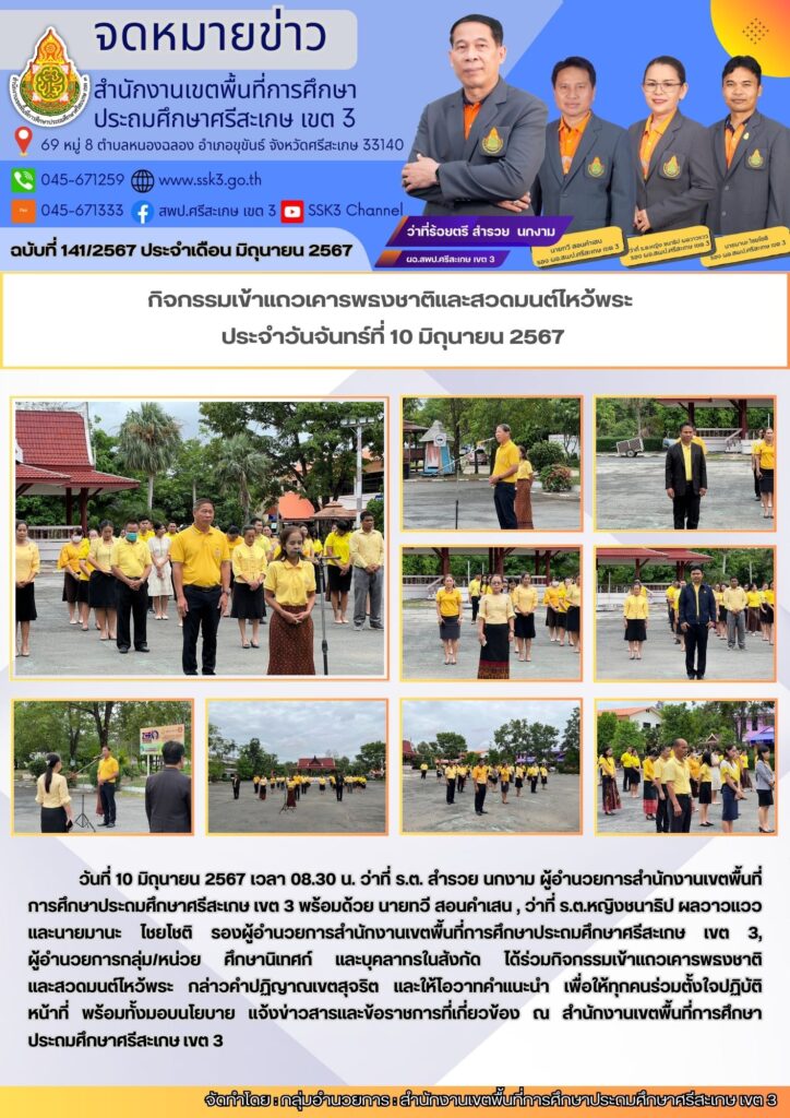 กิจกรรมเข้าแถวเคารพธงชาติและสวดมนต์ไหว้พระ ประจำวันจันทร์ที่ 10 มิถุนายน 2567
