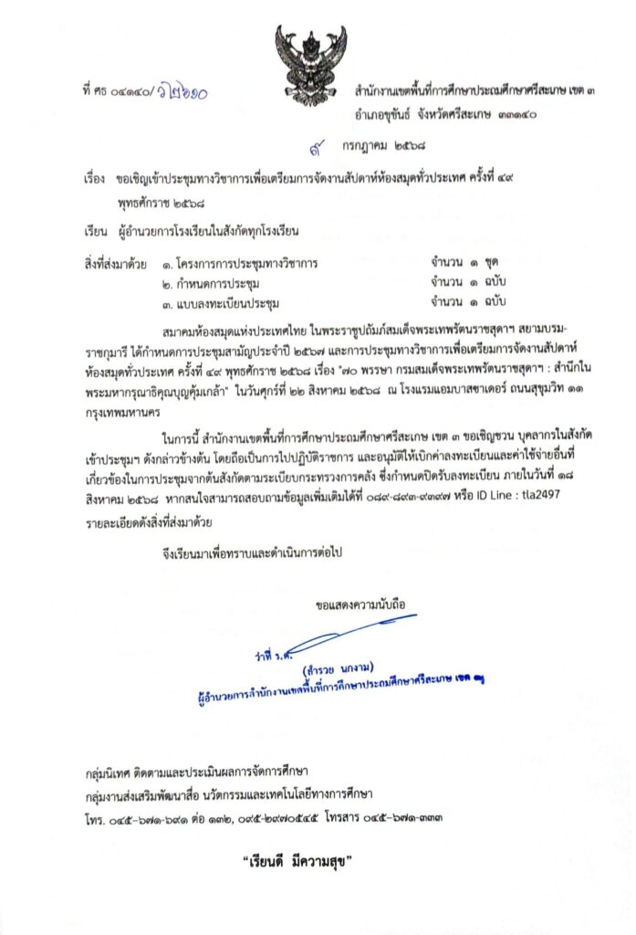 แจ้งทุกโรงเรียนในสังกัด เรื่อง ขอเชิญเข้าประชุมทางวิชาการเพื่อเตรียมการจัดงานสัปดาห์ห้องสมุดทั่วประเทศ ครั้งที่ 49 พุทธศักราช 2568