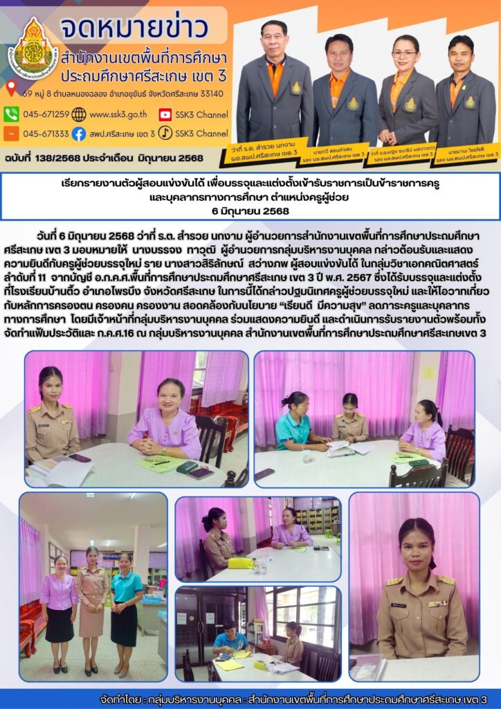 วันที่ 6 มิถุนายน 2568 ว่าที่ ร.ต. สำรวย นกงาม ผู้อำนวยการสำนักงานเขตพื้นที่การศึกษาประถมศึกษาศรีสะเกษ เขต 3 มอบหมายให้ นางบรรจง ทาวุฒิ ผู้อำนวยการกลุ่มบริหารงานบุคคล กล่าวต้อนรับและแสดงความยินดีกับครูผู้ช่วยบรรจุใหม่ ราย นางสาวสิริลักษณ์ สว่างภพ ผู้สอบแข่งขันได้ ในกลุ่มวิชาเอกคณิตศาสตร์ ลำดับที่ 11 จากบัญชี อ.ก.ค.ศ.พื้นที่การศึกษาประถมศึกษาศรีสะเกษ เขต 3 ปี พ.ศ. 2567 ซึ่งได้รับบรรจุและแต่งตั้งที่โรงเรียนบ้านติ้ว อำเภอไพรบึง จังหวัดศรีสะเกษ ในการนี้ได้กล่าวปฐมนิเทศครูผู้ช่วยบรรจุใหม่และให้โอวาทเกี่ยวกับหลักการครองตน ครองคน ครองงาน สอดคล้องกับนโยบาย “เรียนดี มีความสุข” ลดภาระครูและบุคลากรทางการศึกษา โดยมีเจ้าหน้าที่กลุ่มบริหารงานบุคคล ร่วมแสดงความยินดีและดำเนินการรับรายงานตัวพร้อมทั้งจัดทำแฟ้มประวัติและ ก.ค.ศ.16 ณ กลุ่มบริหารงานบุคคล สำนักงานเขตพื้นที่การศึกษาประถมศึกษาศรีสะเกษเขต 3