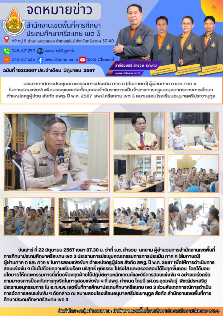 บรรยากาศการประชุมคณะกรรมการประเมิน ภาค ค (สัมภาษณ์) ผู้ผ่านภาค ก และ ภาค ข ในการสอบแข่งขันเพื่อบรรจุและแต่งตั้งบุคคลเข้ารับราชการเป็นข้าราชการครูและบุคลากรทางการศึกษา ตำแหน่งครูผู้ช่วย สังกัด สพฐ. ปี พ.ศ. 2567 สพป.ศรีสะเกษ เขต 3 @สนามสอบโรงเรียนอนุบาลศรีประชานุกูล มิถุนายน 22, 2024 Last updated : มิถุนายน 22, 2024 Chananthita จำนวนคนดู : 52
