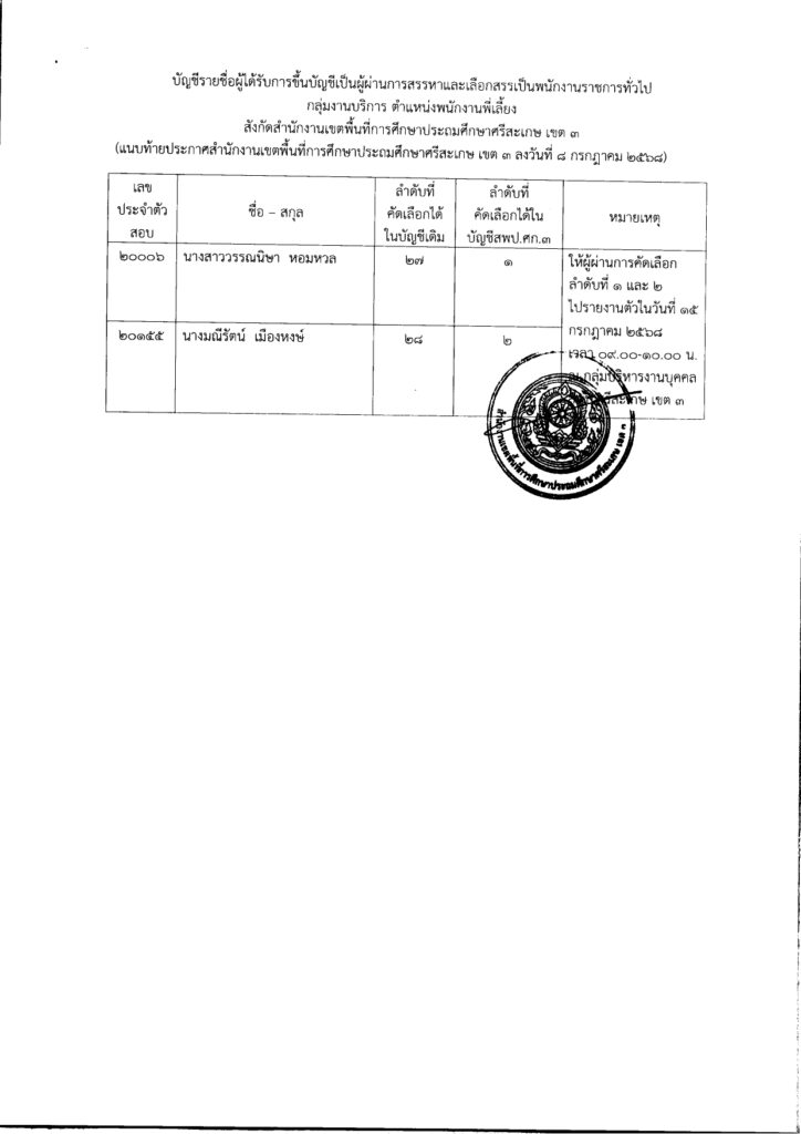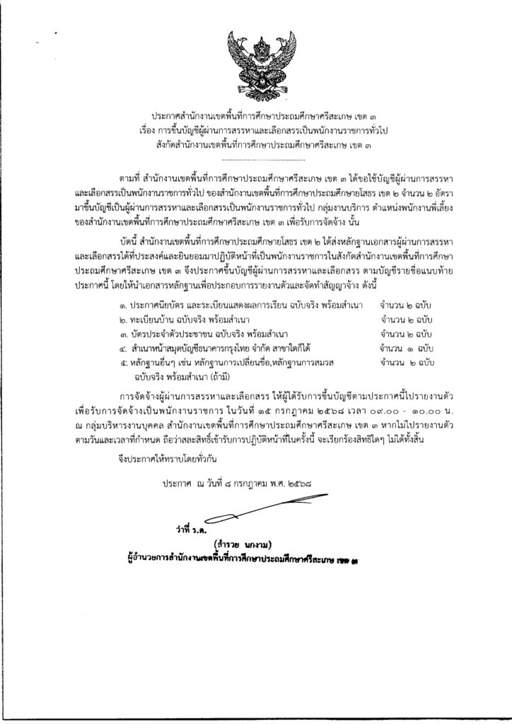 - ประกาศสำนักงานเขตพื้นที่การศึกษาประถมศึกษาศรีสะเกษ เขต ๓เรื่อง การขึ้นบัญชีผู้ผ่านการสรรหาและเลือกสรรเป็นพนักงานราชการทั่วไปสังกัดสำนักงานเขตพื้นที่การศึกษาประถมศึกษาศรีสะเกษ เขต ๓