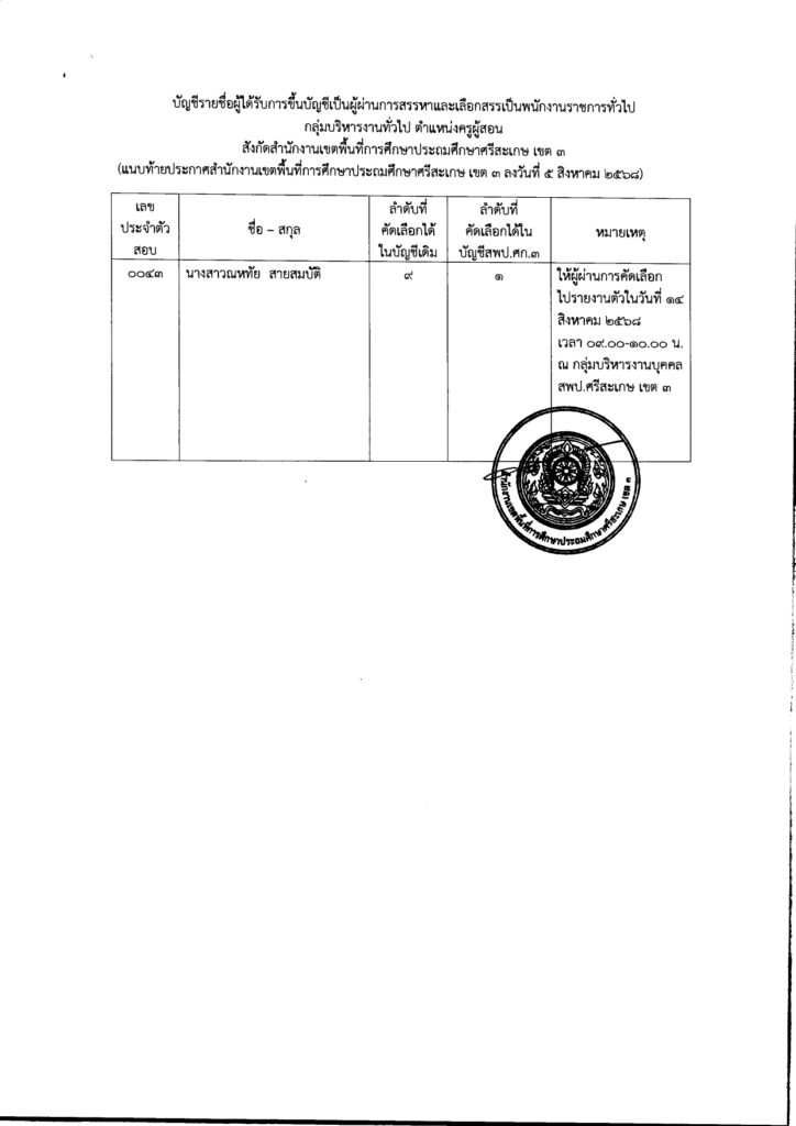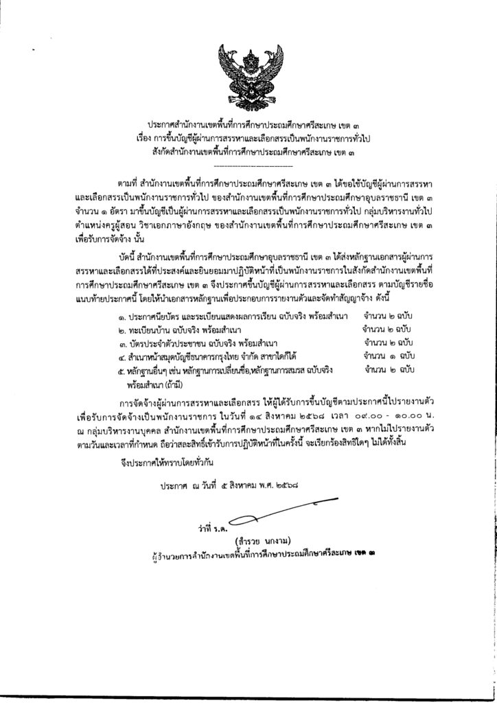 ประกาศสำนักงานเขตพื้นที่การศึกษาประถมศึกษาศรีสะเกษ เขต ๓เรื่อง การขึ้นบัญชีผู้ผ่านการสรรหาและเลือกสรรเป็นพนักงานราชการทั่วไปสังกัดสำนักงานเขตพื้นที่การศึกษาประถมศึกษาศรีสะเกษ เขต ๓ สิงหาคม 7, 2025 Last updated : สิงหาคม 7, 2025 person จำนวนคนดู : 59