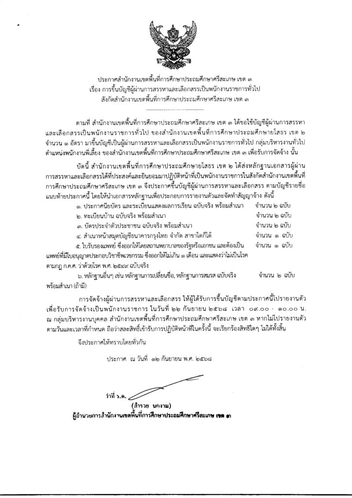 ประกาศสำนักงานเขตพื้นที่การศึกษาประถมศึกษาศรีสะเกษ เขต ๓เรื่อง การขึ้นบัญชีผู้ผ่านการสรรหาและเลือกสรรเป็นพนักงานราชการทั่วไปสังกัดสำนักงานเขตพื้นที่การศึกษาประถมศึกษาศรีสะเกษ เขต ๓ กันยายน 12, 2025 Last updated : กันยายน 12, 2025 person จำนวนคนดู : 49