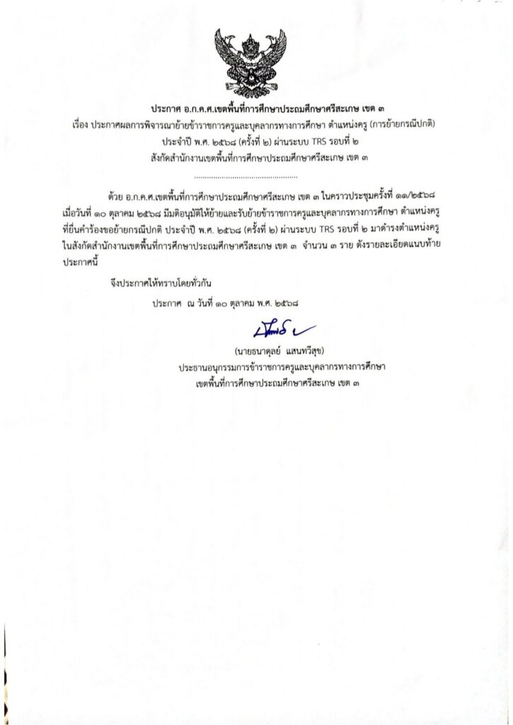 ประกาศ อ.ก.ค.ศ.เขตพื้นที่การศึกษาประถมศึกษาศรีสะเกษ เขต 3 เรื่อง ผลการพิจารณาย้ายกรณีปกติ ประจำปี พ.ศ. 2568 (ครั้งที่ 2) ผ่านระบบ TRS รอบที่ 2 จำนวน 3 ราย ตุลาคม 10, 2025 Last updated : ตุลาคม 10, 2025 person จำนวนคนดู : 45