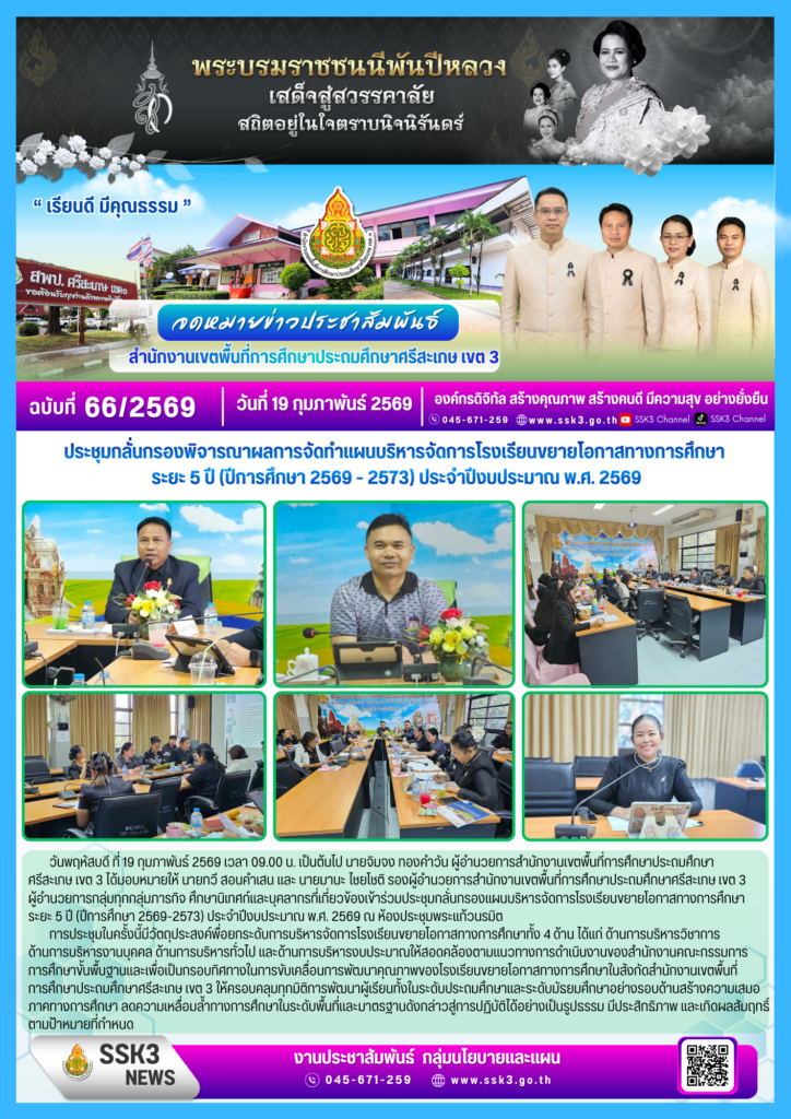 ประชุมกลั่นกรองพิจารณาผลการจัดทำแผนบริหหารจัดการโรงเรียนขยายโอกาสทางการศึกษา ระยะ 5 ปี (ปีการศึกาษา 2569-2573) ประจำปีงบประมาณ พ.ศ. 2569 กุมภาพันธ์ 23, 2026 Last updated : กุมภาพันธ์ 23, 2026 sirivimon จำนวนคนดู : 23