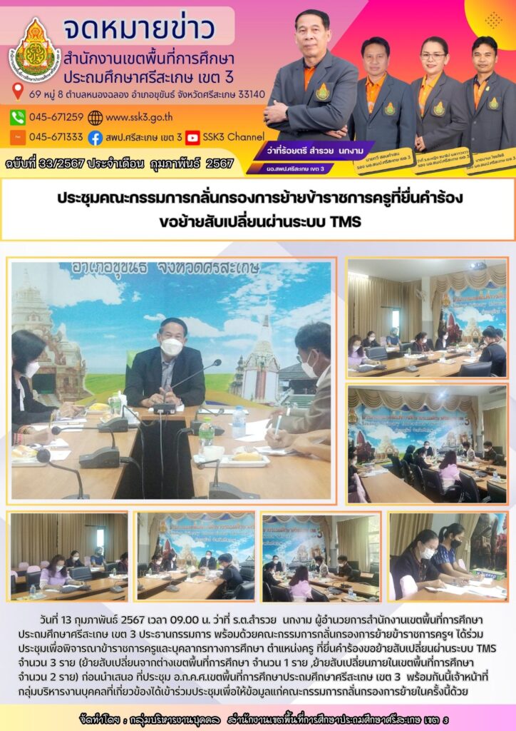 ประชุมคณะกรรมการกลั่นกรองการย้ายข้าราชการครูที่ยื่นคำร้องขอย้ายสับเปลี่ยนผ่านระบบ TMS กุมภาพันธ์ 14, 2024 Last updated : กุมภาพันธ์ 14, 2024 Chananthita จำนวนคนดู : 30