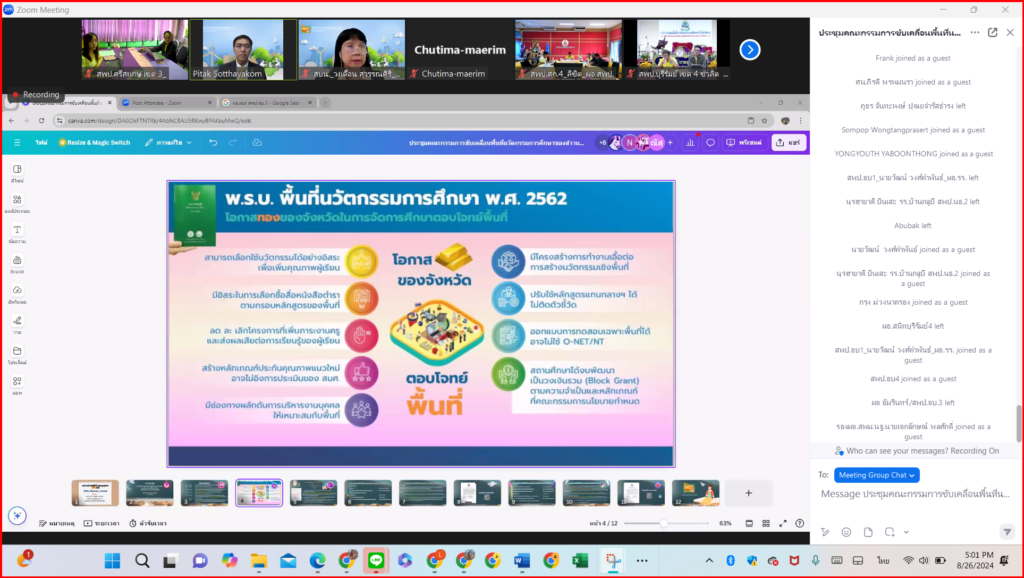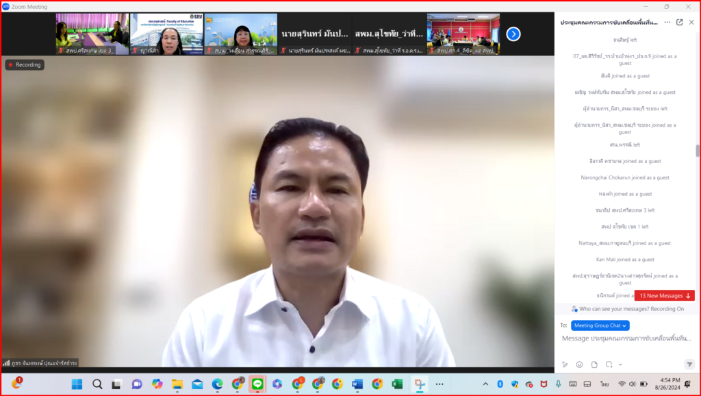 วันที่ 26 สิงหาคม 2567 เวลา 16.30 - 18.30 น. ว่าที่ร้อยตรี สำรวย นกงาม ผู้อำนวยการสำนักงานเขตพื้นที่การศึกษาประถมศึกษาศรีสะเกษ เขต 3 มอบหมายให้ ว่าที่ร้อยตรีหญิงชนาธิป ผลวาวแวว รองผู้อำนวยการสำนักงานเขตพื้นที่การศึกษาประถมศึกษาศรีสะเกษ เขต 3 นายประจักษ์ ทองเลิศ ผู้อำนวยการกลุ่มนิเทศ ติดตาม และประเมินผลการจัดการศึกษา คณะกรรมการขับเคลื่อนพื้นทีนวัตกรรมการศึกษาของสำนักงานเขตพื้นที่การศึกษา และศึกษานิเทศก์ ร่วมการประชุมคณะกรรมการขับเคลื่อนพื้นทีนวัตกรรมการศึกษาของสำนักงานเขตพื้นที่การศึกษา เพื่อสร้างความเข้าใจเกี่ยวกับนโยบายและแผนขับเคลื่อนพื้นที่นวัตกรรมการศึกษา ระดับเขตพื้นที่การศึกษา ผ่านสื่ออิเล็กทรอนิกส์ (โปรแกรม Zoom Meetings) สอดคล้องกับนโยบายและจุดเน้น สพฐ. พ.ศ. 2567 การยกระดับคุณภาพการศึกษา