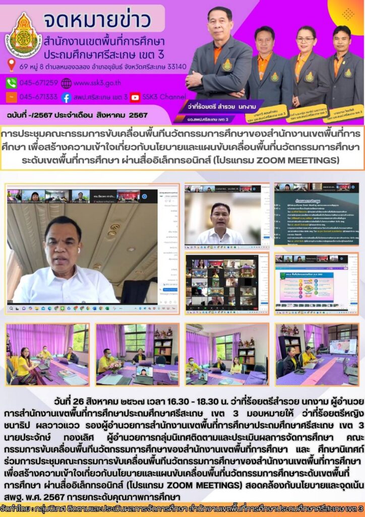 ประชุมคณะกรรมการขับเคลื่อนพื้นทีนวัตกรรมการศึกษาของสำนักงานเขตพื้นที่การศึกษา เพื่อสร้างความเข้าใจเกี่ยวกับนโยบายและแผนขับเคลื่อนพื้นที่นวัตกรรมการศึกษา ระดับเขตพื้นที่การศึกษา ผ่านสื่ออิเล็กทรอนิกส์ (โปรแกรม Zoom Meetings)
