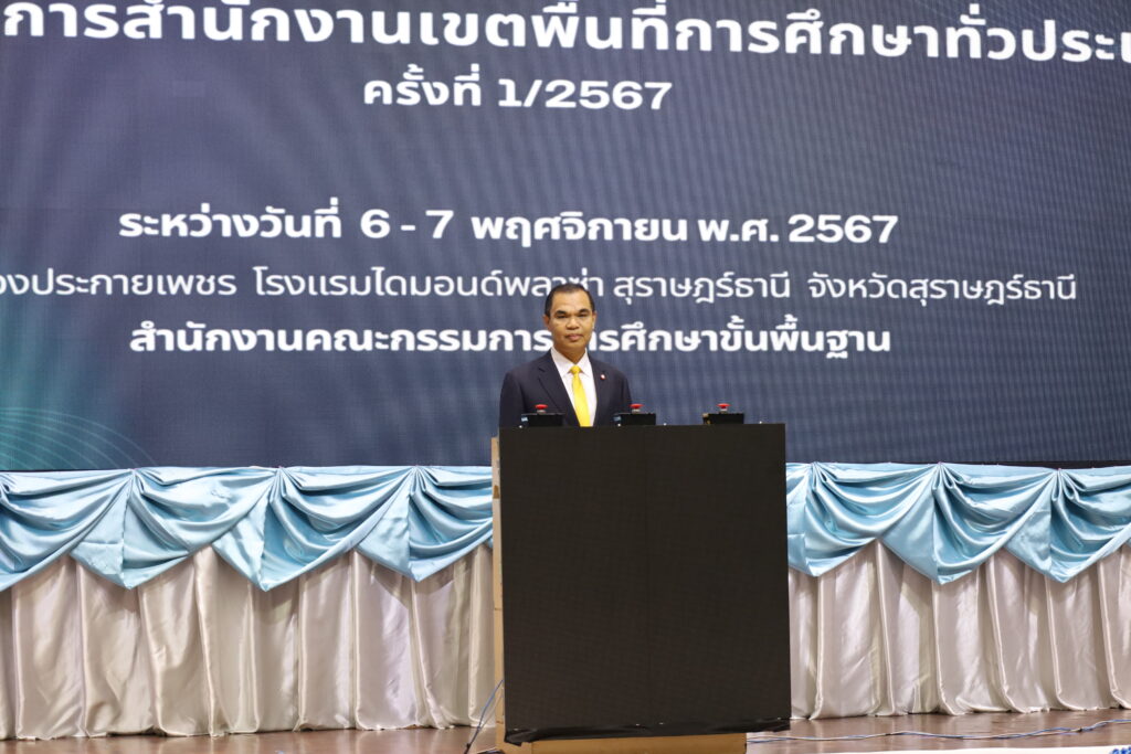 วันที่ 7 พฤศจิกายน 2567 ว่าที่ร้อยตรีสำรวย นกงาม ผู้อำนวยการสำนักงานเขตพื้นที่การศึกษาประถมศึกษาศรีสะเกษ เขต 3 พร้อมด้วย ว่าที่ร้อยตรีหญิงชนาธิป ผลวาวแวว รองผู้อำนวยการสำนักงานเขตพื้นที่การศึกษาประถมศึกษาศรีสะเกษ เขต 3 และผู้อำนวยการกลุ่มพัฒนาครูและบุคลากรทางการศึกษา เข้าร่วมประชุมสัมมนาผู้อำนวยการสำนักงานเขตพื้นที่การศึกษาทั่วประเทศ ครั้งที่ 1/2567 เพื่อรับมอบนโยบายและจุดเน้นของ สพฐ. ประจำปีงบประมาณ 2568-2569 “เรียนดี มีความสุข” ภายใต้ 1.การจัดการศึกษาเพื่อความเป็นเลิศ 2. การจัดการศึกษาเพื่อความมั่นคงของชีวิต ทั้งนี้นโยบายดังกล่าวยังมีเป้าหมาย ลดภาระครูและบุคลากรทางการศึกษา ลดภาระนักเรียนและผู้ปกครอง เพื่อการขับเคลื่อนระบบการศึกษาทุกมิติให้นักเรียน “เรียนดี มีความสุข” โดยมี ว่าที่ร้อยตรี ธนุ วงษ์จินดา เลขาธิการคณะกรรมการการศึกษาขั้นพื้นฐาน เป็นประธานเปิดการประชุม ณ ห้องประกายเพชร โรงแรมไดมอนด์ พลาซ่า จังหวัดสุราษฎร์ธานี