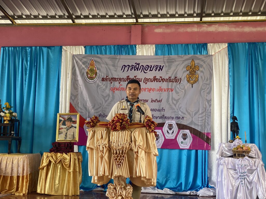 วันที่ 8 สิงหาคม 2567 เวลา 09.00 น. ว่าที่ ร.ต. สำรวย นกงาม ผู้อำนวยการสำนักงานเขตพื้นที่การศึกษาประถมศึกษาศรีสะเกษ เขต 3 มอบหมายให้ นายมานะ ไชยโชติ รองผู้อำนวยการสำนักงานเขตพื้นที่การศึกษาประถมศึกษาศรีสะเกษ เขต 3 เป็นประธานในพิธีเปิดโครงการการฝึกอบรมหลักสูตรลูกเสือจู่โจม (ลูกเสือป้องกันภัย) กลุ่มโรงเรียนโคกตาลตะเคียนราม ในการขยายผลการฝึกอบรมให้กับผู้กำกับลูกเสือ ลูกเสือ และเนตรนารี ในกลุ่มโรงเรียนโคกตาลตะเคียนราม อำเภอภูสิงห์ จำนวน 6 โรงเรียน ณ ค่ายลูกเสือชั่วคราวโรงเรียนบ้านลุมพุกคลองแก้ว มีลูกเสือ และเนตรนารี เข้ารับการฝึกอบรม จำนวน 60 คน