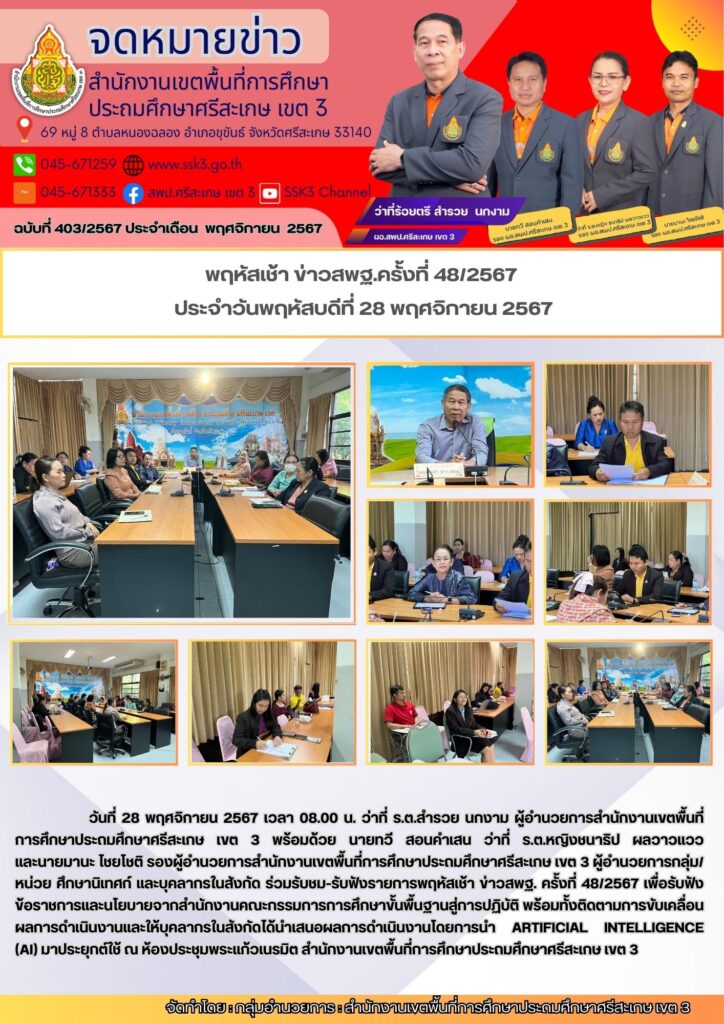 พฤหัสเช้า ข่าวสพฐ.ครั้งที่ 48/2567 ประจำวันพฤหัสบดีที่ 28 พฤศจิกายน 2567 พฤศจิกายน 29, 2024 Last updated : พฤศจิกายน 29, 2024 Chananthita จำนวนคนดู : 26