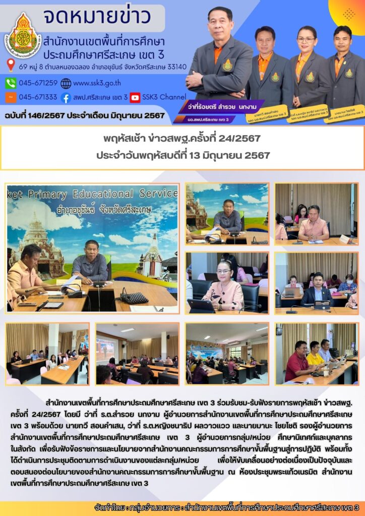 พฤหัสเช้า ข่าวสพฐ.ครั้งที่ 24/2567 ประจำวันพฤหัสบดีที่ 13 มิถุนายน 2567 มิถุนายน 20, 2024 Last updated : มิถุนายน 20, 2024 Chananthita จำนวนคนดู : 14