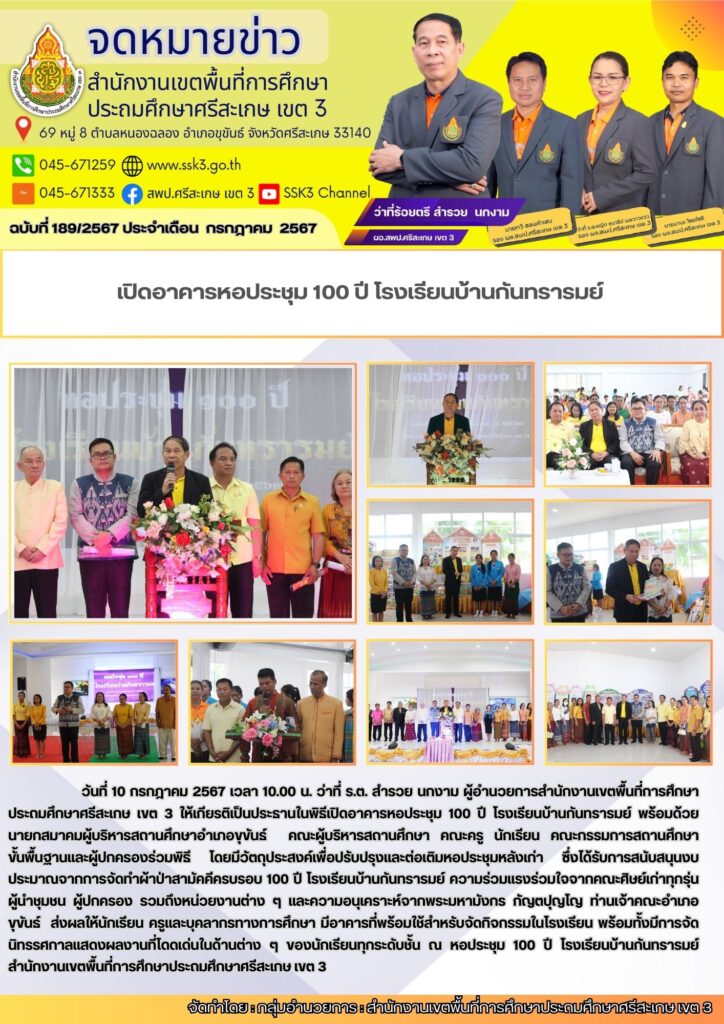 พิธีเปิดอาคารหอประชุม 100 ปี โรงเรียนบ้านกันทรารมย์ กรกฎาคม 10, 2024 Last updated : กรกฎาคม 10, 2024 Chananthita จำนวนคนดู : 194