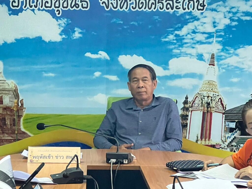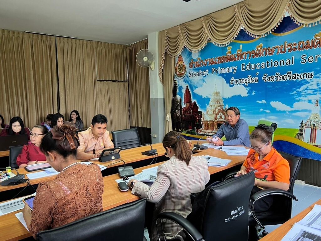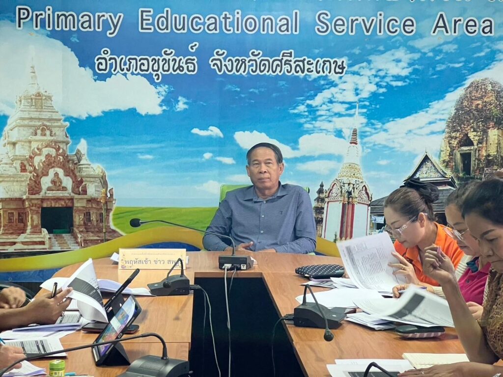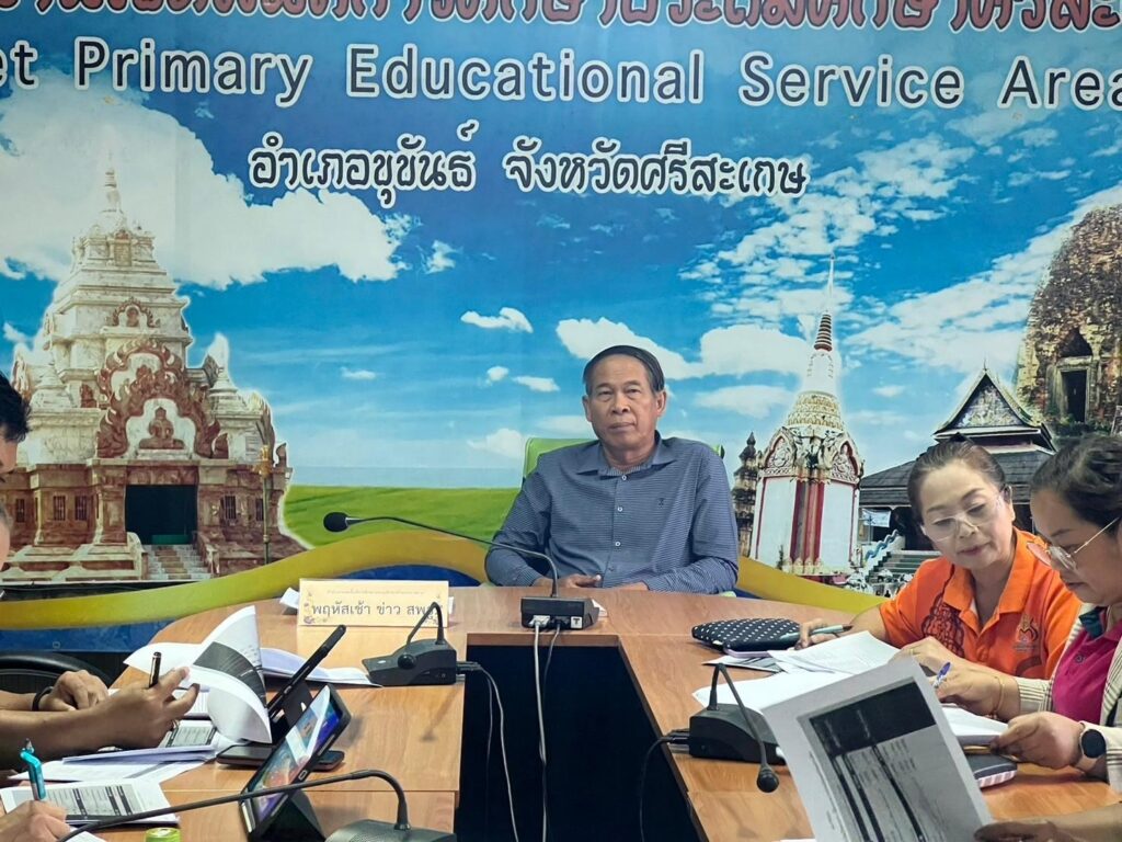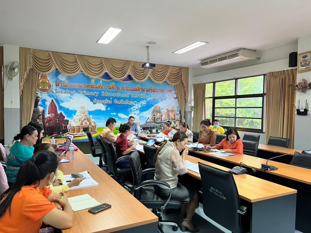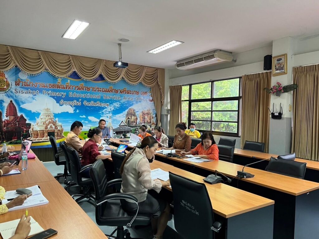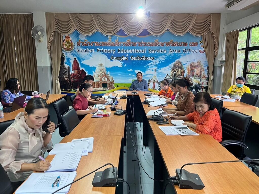 วันที่ 23 พฤษภาคม 2567 เวลา 7.30 น. ว่าที่ ร.ต.สำรวย นกงาม ผู้อำนวยการสำนักงานเขตพื้นที่การศึกษาประถมศึกษาศรีสะเกษ เขต 3 พร้อมด้วย ว่าที่ ร.ต.หญิงชนาธิป ผลวาวแวว และนายมานะ ไชยโชติ รองผู้อำนวยการสำนักงานเขตพื้นที่การศึกษาประถมศึกษาศรีสะเกษ เขต 3 ผู้อำนวยการกลุ่ม/หน่วย ศึกษานิเทศก์และบุคลากรในสังกัด รับชม-รับฟังรายการพฤหัสเช้า ข่าวสพฐ. ครั้งที่ 21/2567 เพื่อรับมอบข้อราชการและนโยบายจากสำนักงานคณะกรรมการการศึกษาขั้นพื้นฐานสู่การปฏิบัติ พร้อมทั้งดำเนินการประชุมเพื่อติดตามแผนการดำเนินงานของแต่ละกลุ่ม/หน่วยให้ขับเคลื่อนอย่างต่อเนื่องและเป็นปัจจุบัน เพื่อให้ตอบสนองต่อนโยบายของสำนักงานคณะกรรมการการศึกษาขั้น พื้นฐาน ณ ห้องประชุมพระแก้วเนรมิต สำนักงานเขตพื้นที่การศึกษาประถมศึกษาศรีสะเกษ เขต 3