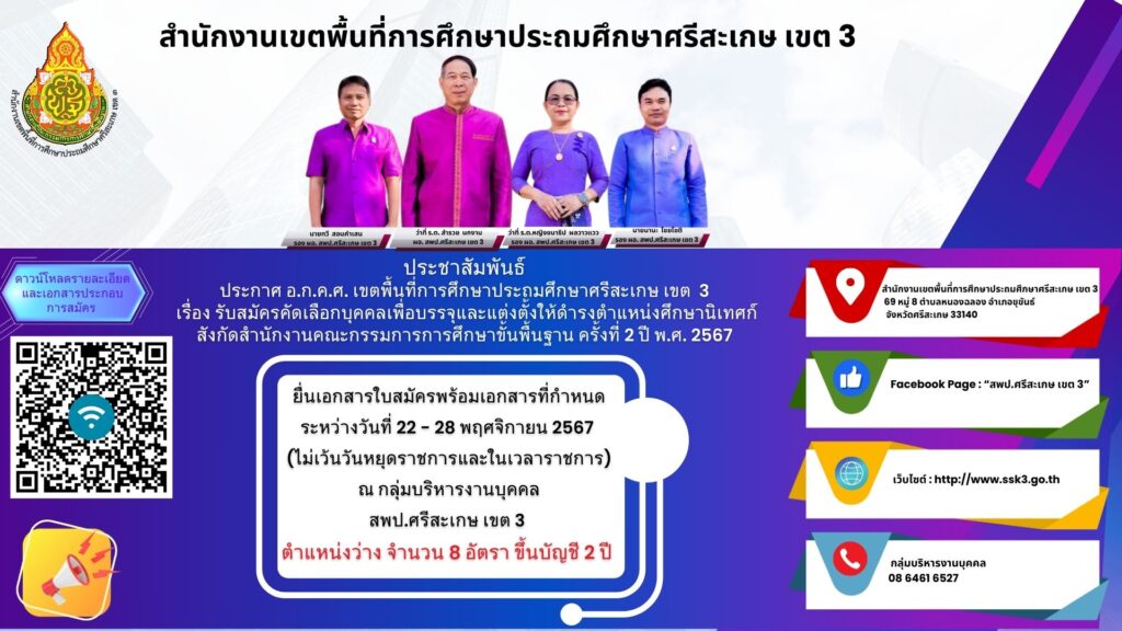 รับสมัครคัดเลือกบุคคลเพื่อบรรจุและแต่งตั้งให้ดำรงตำแหน่งศึกษานิเทศก์ สังกัดสำนักงานคณะกรรมการการศึกษาขั้นพื้นฐาน ครั้งที่ 2 ปี พ.ศ. 2567 จำนวน 8 อัตรา พฤศจิกายน 20, 2024 Last updated : พฤศจิกายน 20, 2024 person จำนวนคนดู : 318