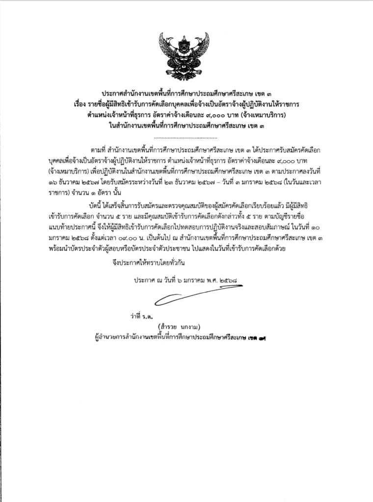 รายชื่อผู้มีสิทธิเข้ารับการคัดเลือกบุคคลเพื่อจ้างเป็นอัตราจ้างผู้ปฏิบัติงานให้ราชการ ตำแหน่งเจ้าหน้าที่ธุรการ อัตราค่าจ้างเดือนละ 9,000 บาท (จ้างเหมาบริการ) ในสำนักงานเขตพื้นที่การศึกษาประถมศึกษาศรีสะเกษ เขต 3 มกราคม 6, 2025 Last updated : มกราคม 6, 2025 person จำนวนคนดู : 41
