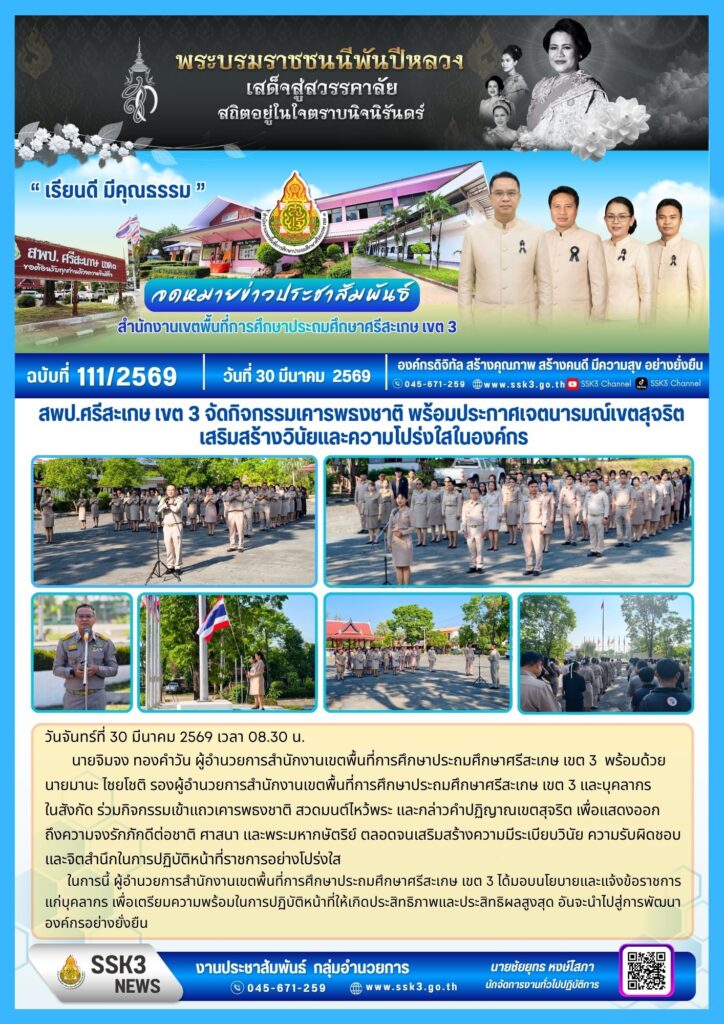สพป.ศรีสะเกษ เขต 3 จัดกิจกรรมเคารพธงชาติ พร้อมประกาศเจตนารมณ์เขตสุจริต เสริมสร้างวินัยและความโปร่งใสในองค์กร มีนาคม 30, 2026 Last updated : มีนาคม 30, 2026 chaiyoot จำนวนคนดู : 10