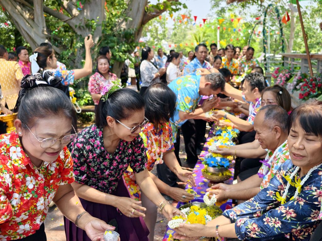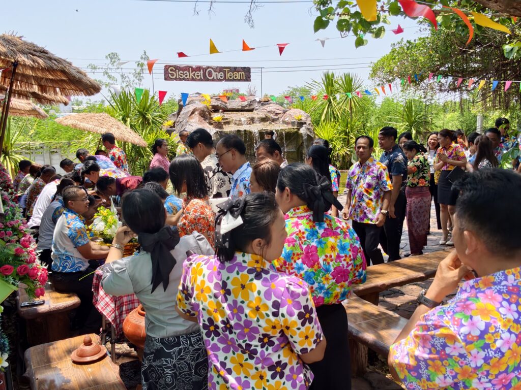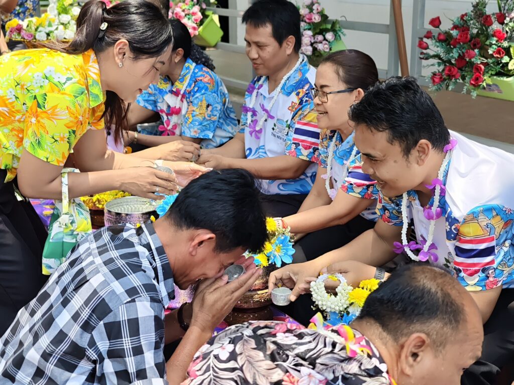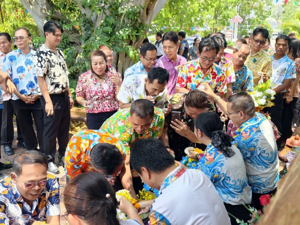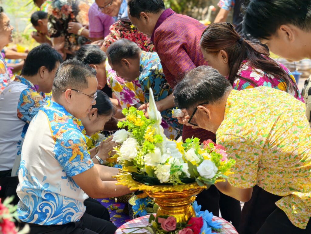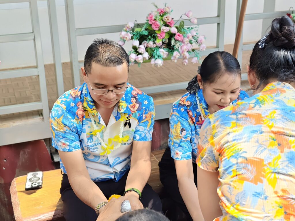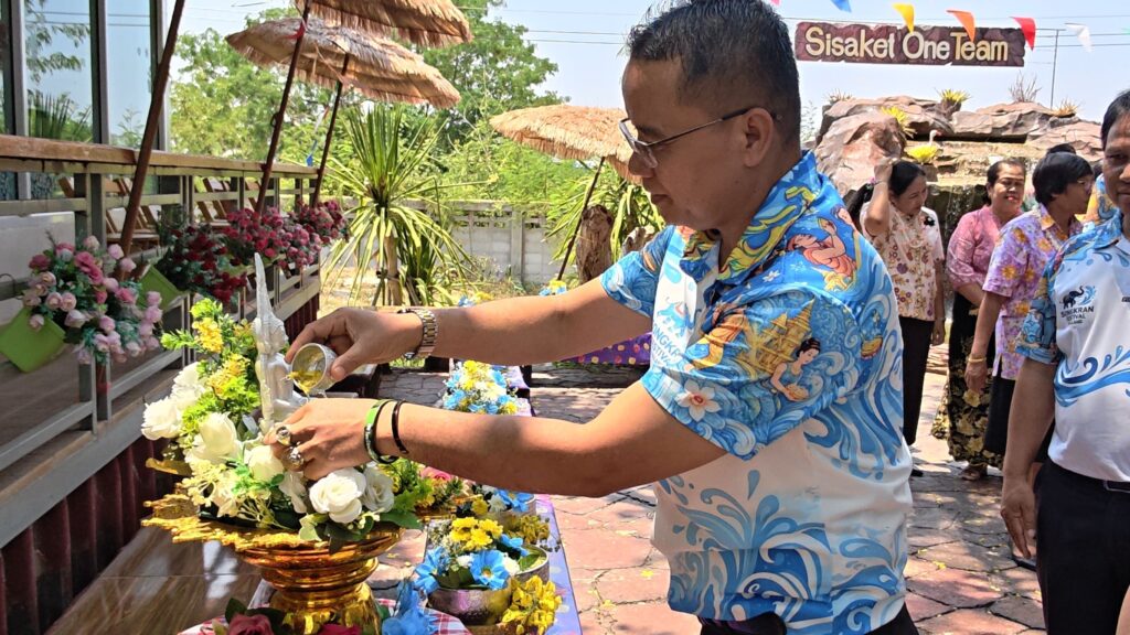 ต่อมาในเวลา 11.00 น. ได้จัดพิธีรดน้ำขอพรจากผู้อำนวยการสำนักงานเขตพื้นที่การศึกษาประถมศึกษาศรีสะเกษ เขต 3 บุคลากรทางการศึกษาผู้อาวุโส และข้าราชการบำนาญ เพื่อแสดงความเคารพและขอพรเนื่องในโอกาสวันปีใหม่ไทย โดยบรรยากาศภายในงานเป็นไปอย่างอบอุ่น เปี่ยมด้วยความรัก ความสามัคคี และความเป็นสิริมงคล