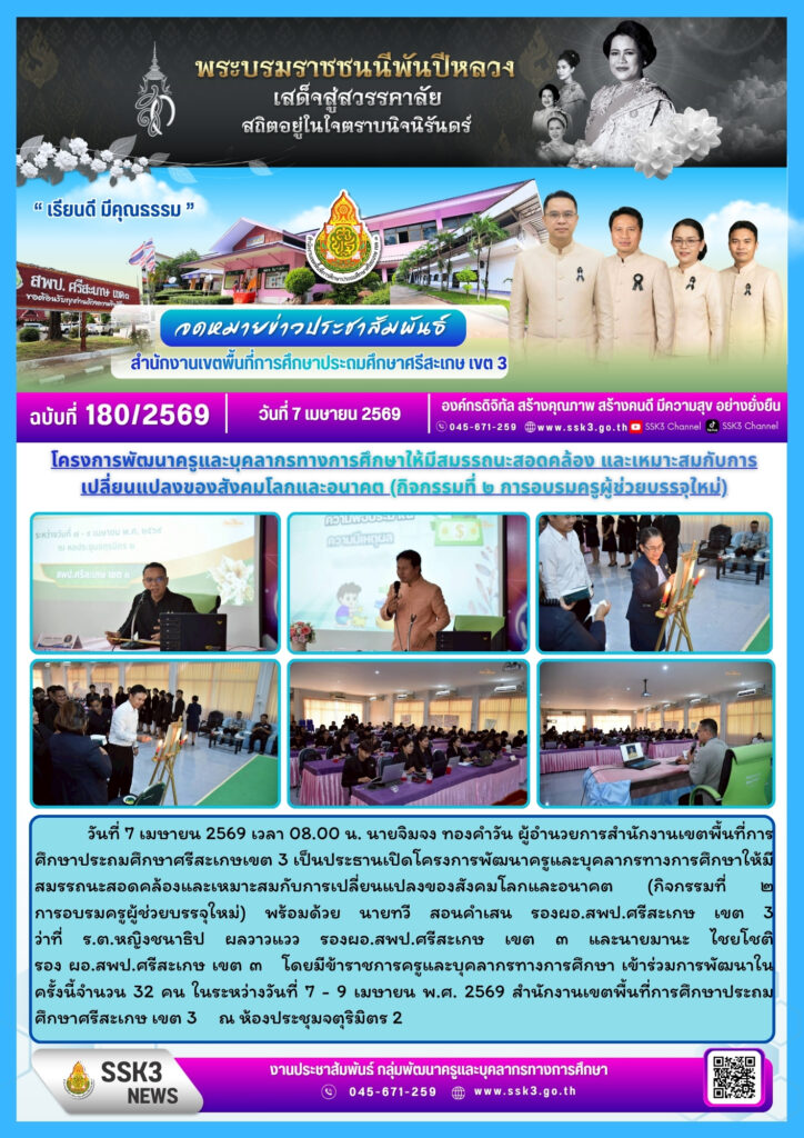 สพป.ศรีสะเกษ เขต 3 จัดอบรมพัฒนาครูผู้ช่วยบรรจุใหม่ เสริมสมรรถนะสู่การเปลี่ยนแปลงในอนาคต เมษายน 21, 2026 Last updated : เมษายน 21, 2026 chaiyoot จำนวนคนดู : 2