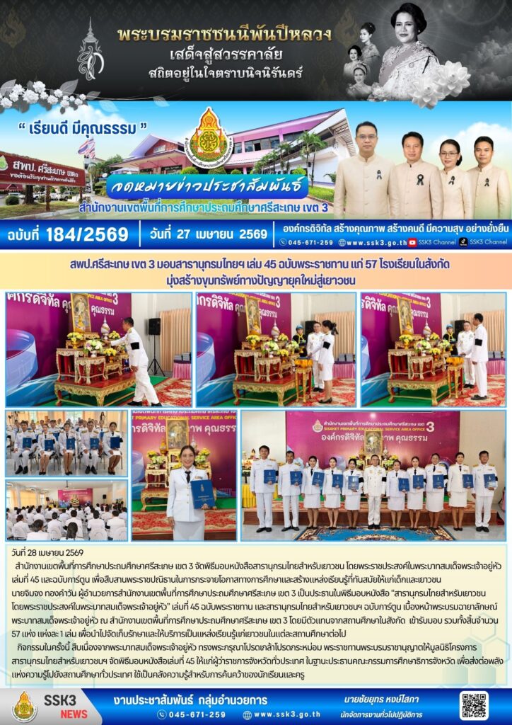 สพป.ศรีสะเกษ เขต 3 มอบสารานุกรมไทยฯ เล่ม 45 ฉบับพระราชทาน แก่ 57 โรงเรียนในสังกัด มุ่งสร้างขุมทรัพย์ทางปัญญายุคใหม่สู่เยาวชน เมษายน 28, 2026 Last updated : เมษายน 28, 2026 chaiyoot จำนวนคนดู : 0