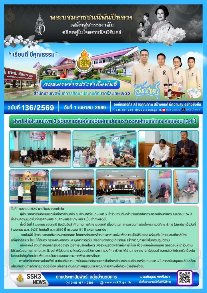สพป.ศรีสะเกษ เขต 3 ร่วมงานวันคล้ายวันสถาปนากระทรวงศึกษาธิการ ครบรอบ 134 ปี เมษายน 1, 2026 Last updated : เมษายน 1, 2026 chaiyoot จำนวนคนดู : 2