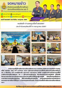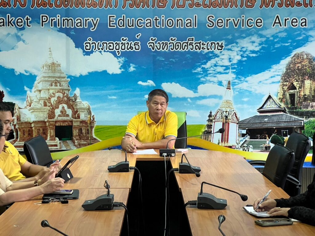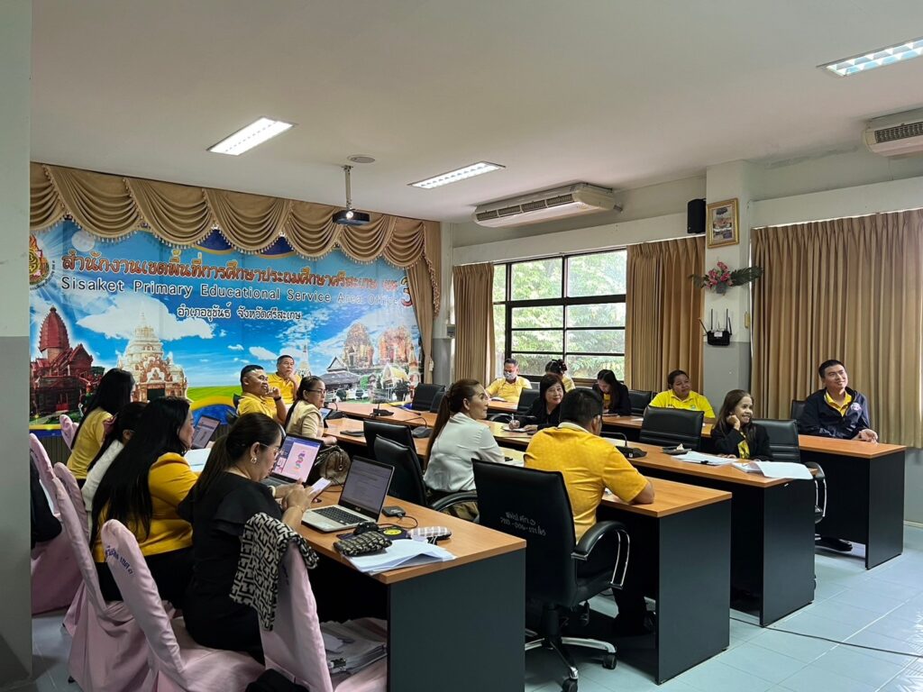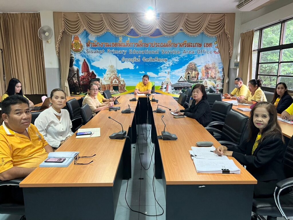 สำนักงานเขตพื้นที่การศึกษาประถมศึกษาศรีสะเกษ เขต 3 ร่วมรับชม-รับฟังรายการพฤหัสเช้า ข่าวสพฐ. ครั้งที่ 28/2567 โดยมี ว่าที่ ร.ต.สำรวย นกงาม ผู้อำนวยการสำนักงานเขตพื้นที่การศึกษาประถมศึกษาศรีสะเกษ เขต 3 พร้อมด้วย ว่าที่ ร.ต.หญิงชนาธิป ผลวาวแวว และนายมานะ ไชยโชติ รองผู้อำนวยการสำนักงานเขตพื้นที่การศึกษาประถมศึกษาศรีสะเกษ เขต 3 ผู้อำนวยการกลุ่ม/หน่วย ศึกษานิเทศก์และบุคลากรในสังกัด เพื่อรับฟังข้อราชการและนโยบายจากสำนักงานคณะกรรมการการศึกษาขั้นพื้นฐานสู่การปฏิบัติ พร้อมทั้งประชุมเพื่อติดตามการดำเนินงานของแต่ละกลุ่ม/หน่วย ให้มีการขับเคลื่อนอย่างต่อเนื่อง และตอบสนองต่อนโยบายของสำนักงานคณะกรรมการการศึกษาขั้นพื้นฐาน ณ ห้องประชุมพระแก้วเนรมิต สำนักงานเขตพื้นที่การศึกษาประถมศึกษาศรีสะเกษ เขต 3