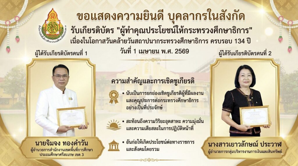 สำนักงานเขตพื้นที่การศึกษาประถมศึกษาศรีสะเกษ เขต 3 ขอแสดงความยินดีกับบุคลากรในสังกัด ที่ได้รับเกียรติบัตร “ผู้ทำคุณประโยชน์ให้กระทรวงศึกษาธิการ” จำนวน 2 ราย เนื่องในโอกาสวันคล้ายวันสถาปนากระทรวงศึกษาธิการ ครบรอบ 134 ปี วันที่ 1 เมษายน พ.ศ. 2569