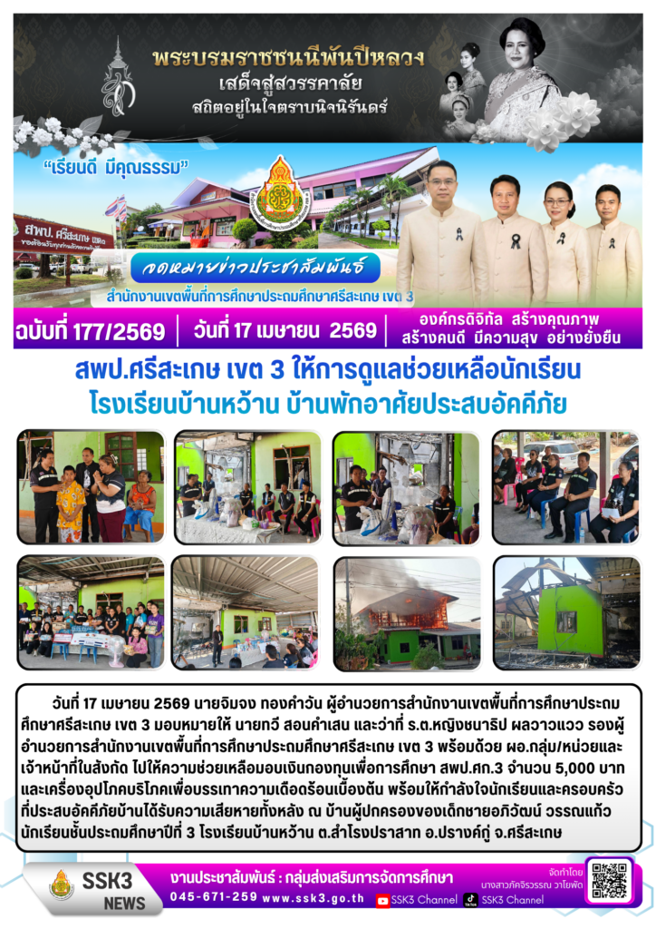 สพป.ศรีสะเกษ เขต 3 ให้การดูแลช่วยเหลือนักเรียน โรงเรียนบ้านหว้าน บ้านพักอาศัยประสบอัคคีภัย