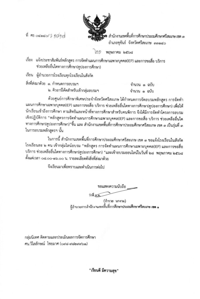 ขอแจ้งประชาสัมพันธ์ทุกโรงเรียนในสังกัด เรื่อง แจ้งประชาสัมพันธ์หลักสูตร การจัดทำแผนการศึกษาเฉพาะบุคคล (IEP) และการขอสื่อ บริการช่วยเหลืออื่นใดทางการศึกษา (คูปองการศึกษา)