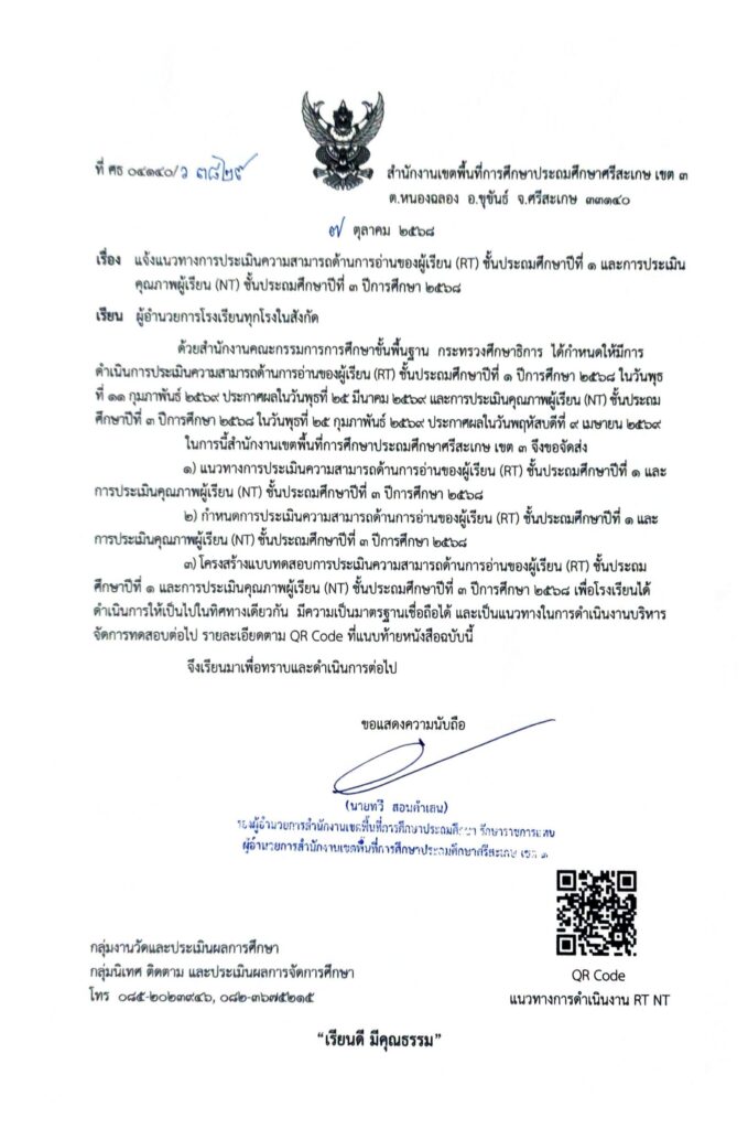แจ้งแนวทางการประเมินความสามารถด้านการอ่านของผู้เรียน (RT) ชั้นประถมศึกษาปีที่ 1 และการประเมินคุณภาพผู้เรียน (NT) ชั้นประถมศึกษาปีที่ 3 ปีการศึกษา 2568 ตุลาคม 7, 2025 Last updated : ตุลาคม 7, 2025 nitad คลิ๊ก หนังสือที่ ว3829 จำนวนคนดู : 55