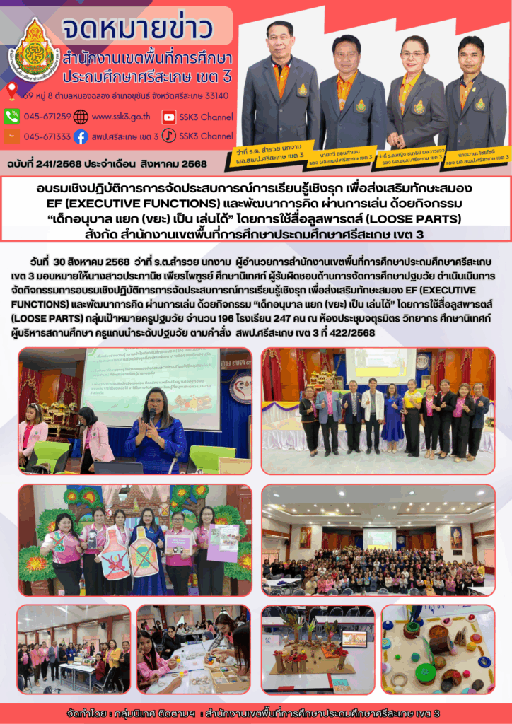 โครงการการป้องกันและแก้ไขปัญหายาเสพติดในสถานศึกษาสำนักงานเขตพื้นที่การศึกษาประถมศึกษาศรีสะเกษ เขต 3 ประจำปีงบประมาณ พ.ศ. 2568 กันยายน 2, 2025 Last updated : กันยายน 2, 2025 nitad กิจกรรม อบรมเชิงปฏิบัติการการจัดประสบการณ์การเรียนรู้เชิงรุก เพื่อส่งเสริมทักษะสมอง EF (Executive Functions) และพัฒนาการคิด ผ่านการเล่น ด้วยกิจกรรม “เด็กอนุบาล แยก (ขยะ) เป็น เล่นได้” โดยการใช้สื่อลูสพารตส์ (Loose Parts) สังกัด สำนักงานเขตพื้นที่การศึกษาประถมศึกษาศรีสะเกษ เขต 3 จำนวนคนดู : 27