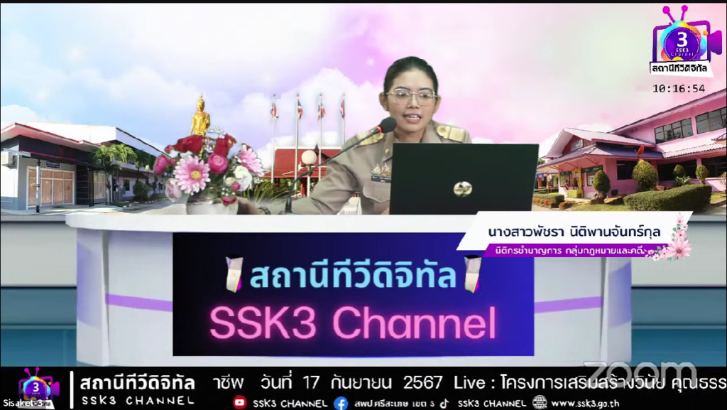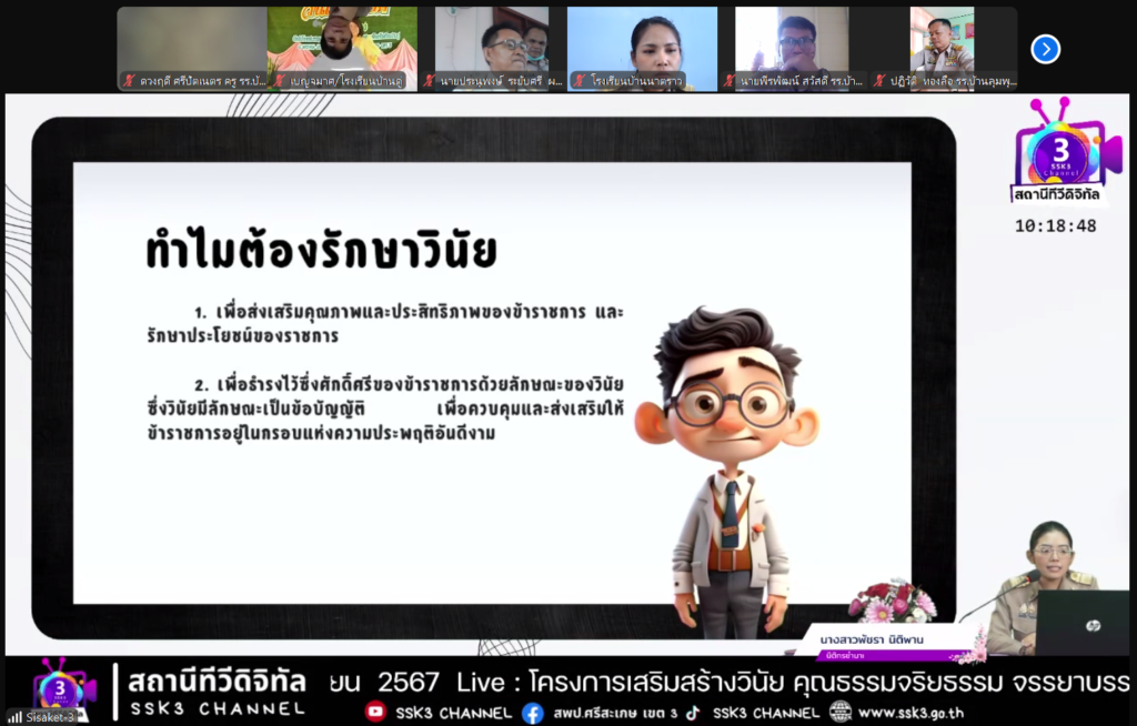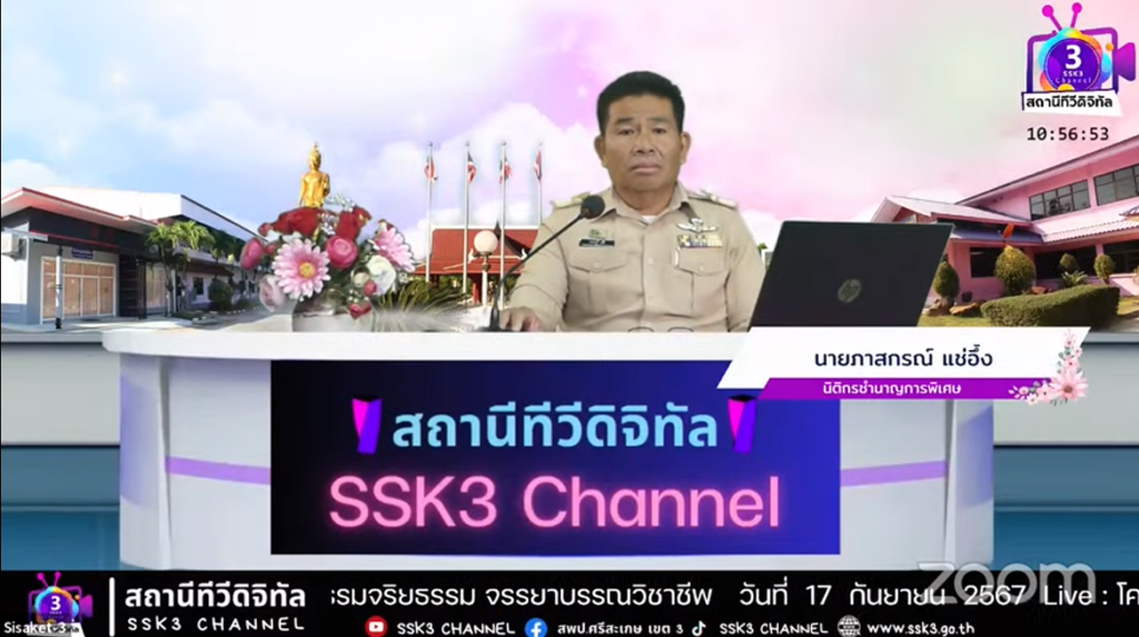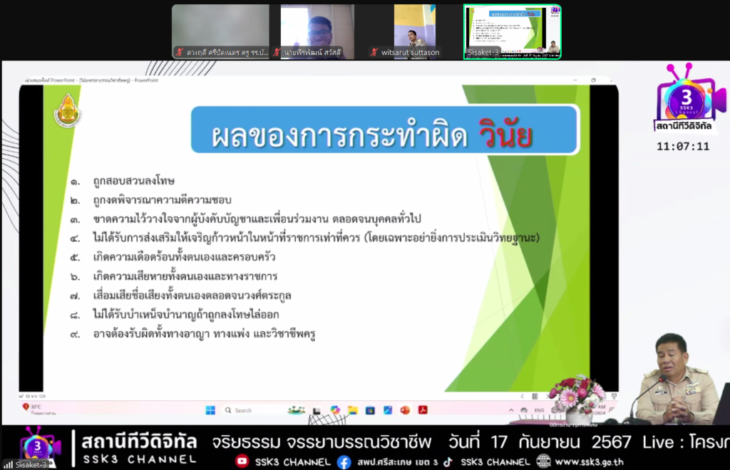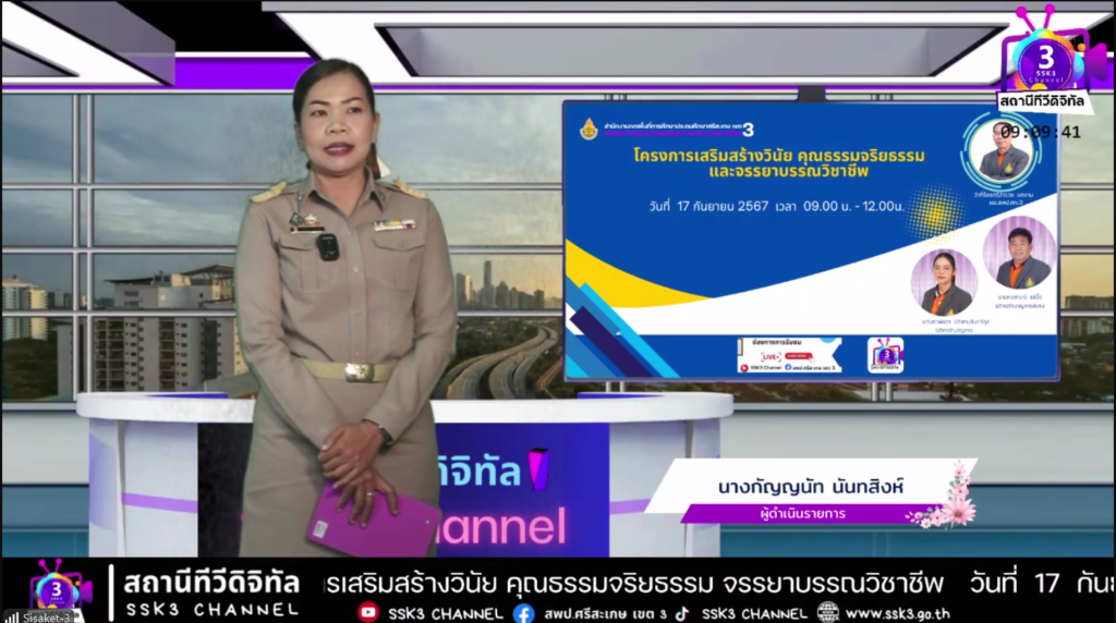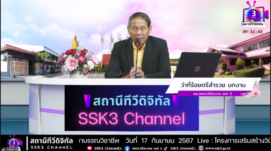วันที่ 17 กันยายน 2567 เวลา 09.00 น. ว่าที่ร้อยตรีสำรวย นกงาม ผู้อำนวยการสำนักงานเขตพื้นที่การศึกษาประถมศึกษาศรีสะเกษ เขต 3 เป็นประธานเปิดโครงการเสริมสร้างวินัย คุณธรรมจริยธรรม และจรรยาบรรณวิชาชีพ โดยมีวัตถุประสงค์เพื่อเสริมสร้างความรู้ความเข้าใจเกี่ยวกับวินัย และจรรยาบรรณวิชาชีพแก่ข้าราชการครูและบุคลากรทางการศึกษา ซึ่งจะส่งผลให้ข้าราชการและบุคลากรทางการศึกษาในสังกัดสำนักงานเขตพื้นที่การศึกษาประถมศึกษาศรีสะเกษ เขต 3 ปฏิบัติงานอย่างเป็นระบบ โปร่งใส ตรวจสอบได้ ณ สถานีทีวีดิจิทัล SSK3 Channel สำนักงานเขตพื้นที่การศึกษาประถมศึกษาศรีสะเกษ เขต 3