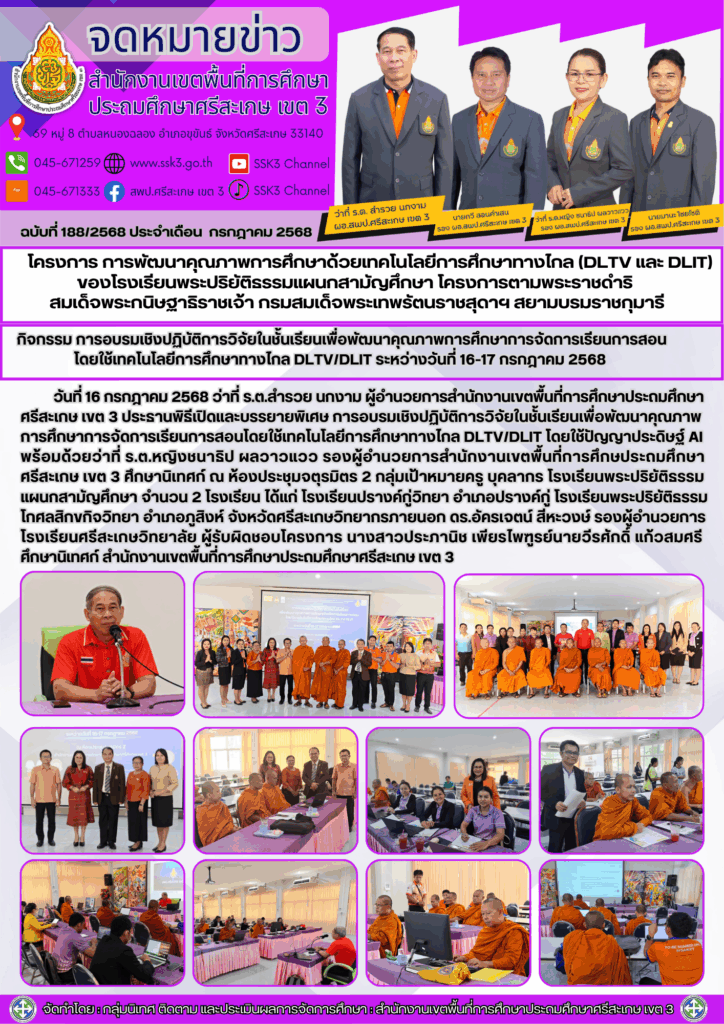 โครงการ การพัฒนาคุณภาพการศึกษาด้วยเทคโนโลยีการศึกษาทางไกล (DLTV และ DLIT) ของโรงเรียนพระปริยัติธรรมแผนกสามัญศึกษา โครงการตามพระราชดำริ สมเด็จพระกนิษฐาธิราชเจ้า กรมสมเด็จพระเทพรัตนราชสุดาฯ สยามบรมราชกุมารี กรกฎาคม 18, 2025 Last updated : กรกฎาคม 18, 2025 nitad กิจกรรม การอบรมเชิงปฏิบัติการวิจัยในชั้นเรียนเพื่อพัฒนาคุณภาพการศึกษาการจัดการเรียนการสอนโดยใช้เทคโนโลยีการศึกษาทางไกล DLTV/DLIT ระหว่างวันที่ 16-17 กรกฎาคม 2568 จำนวนคนดู : 57